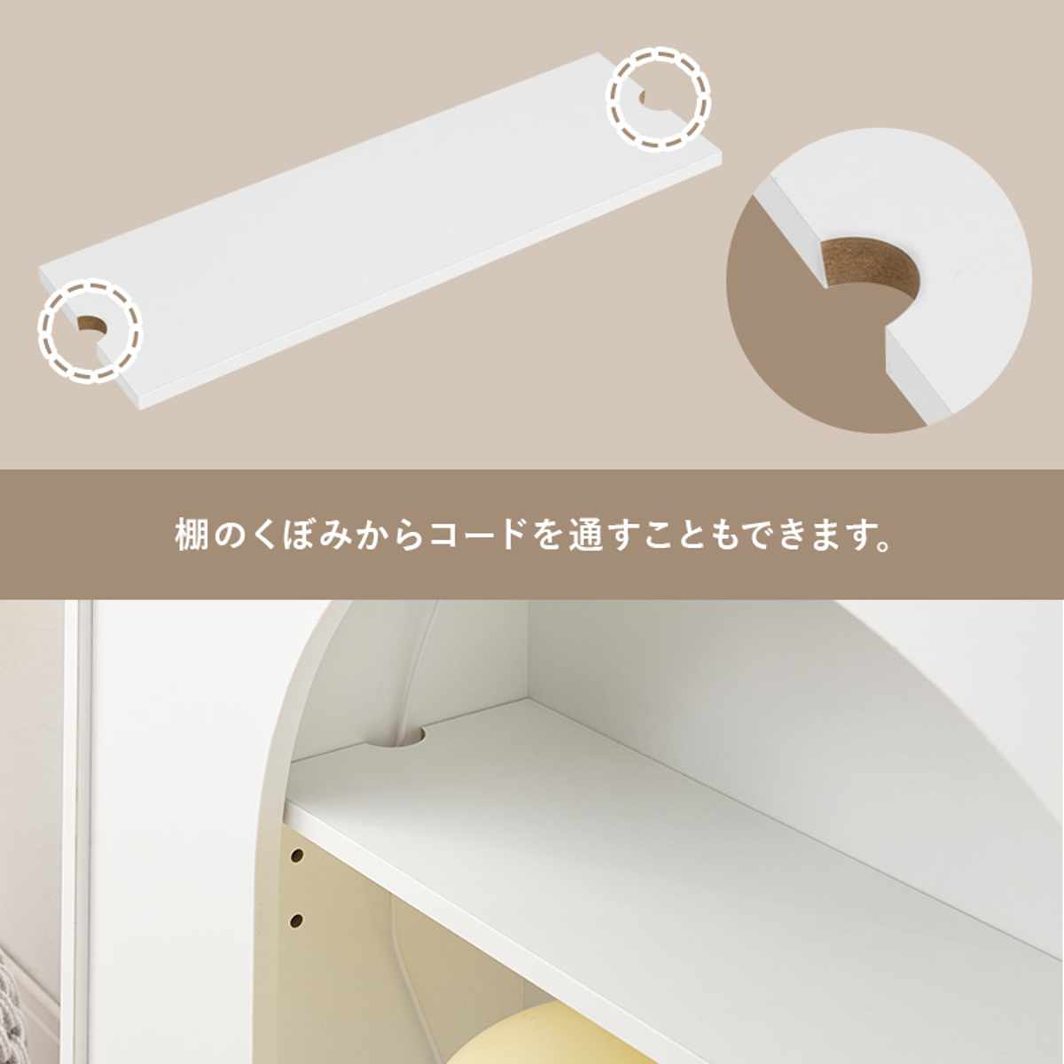 背面3か所にコード穴があるので、ライトやスピーカーを使用できます。棚の左右にもコードを通せるくぼみがあるので、配線がスッキリします。