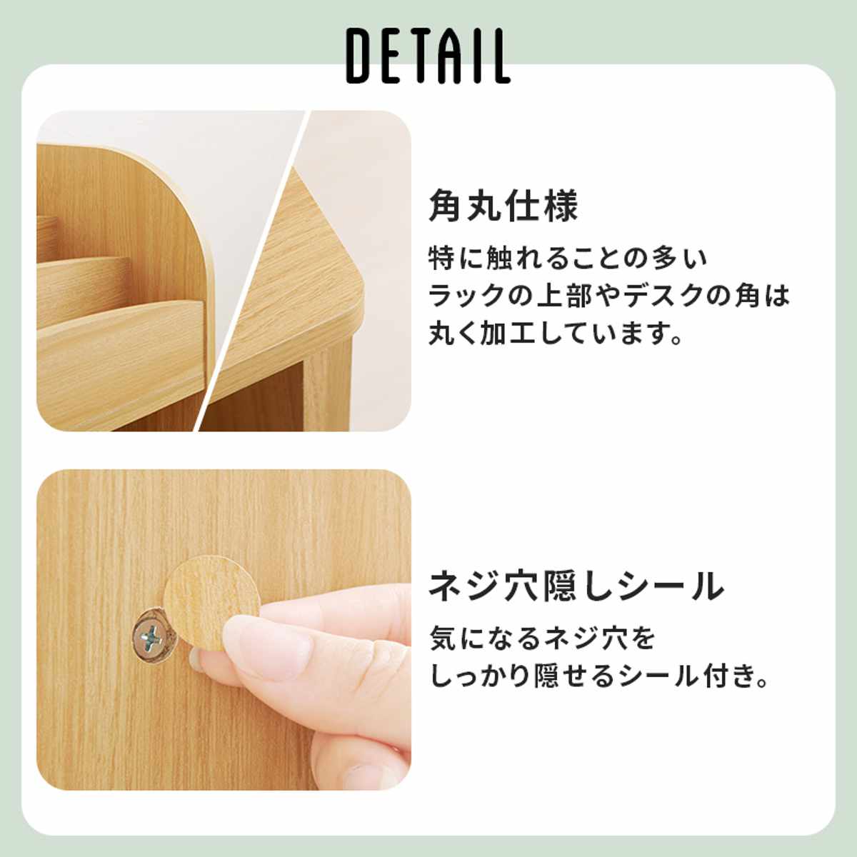 特に触れることの多いラック上部やデスクの角は丸く加工しているので、安心してお使いいただけます。