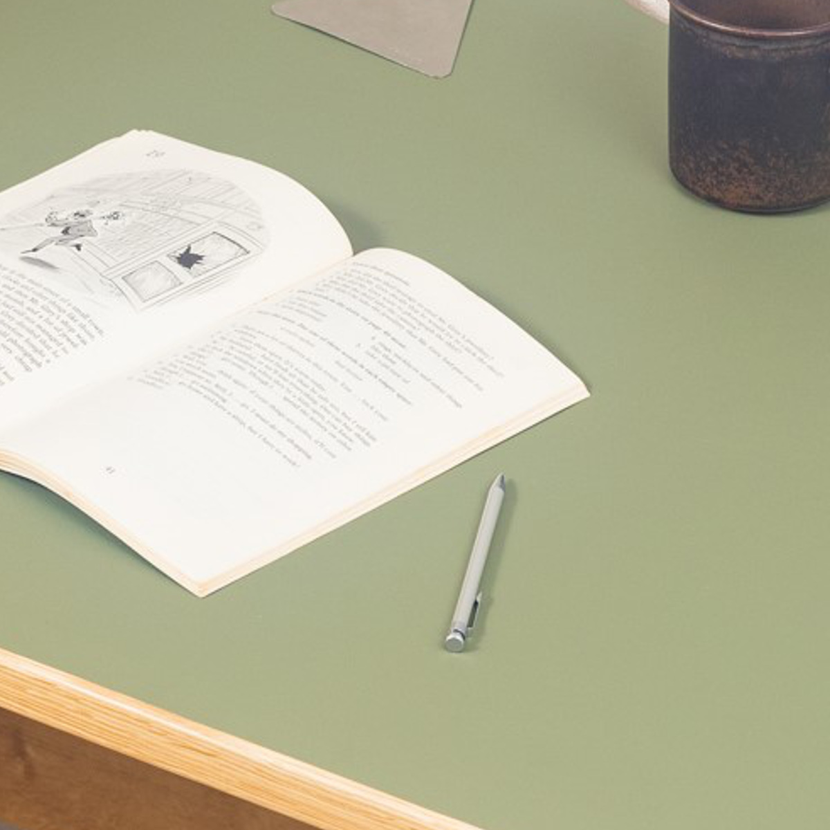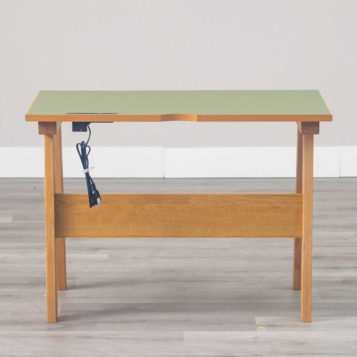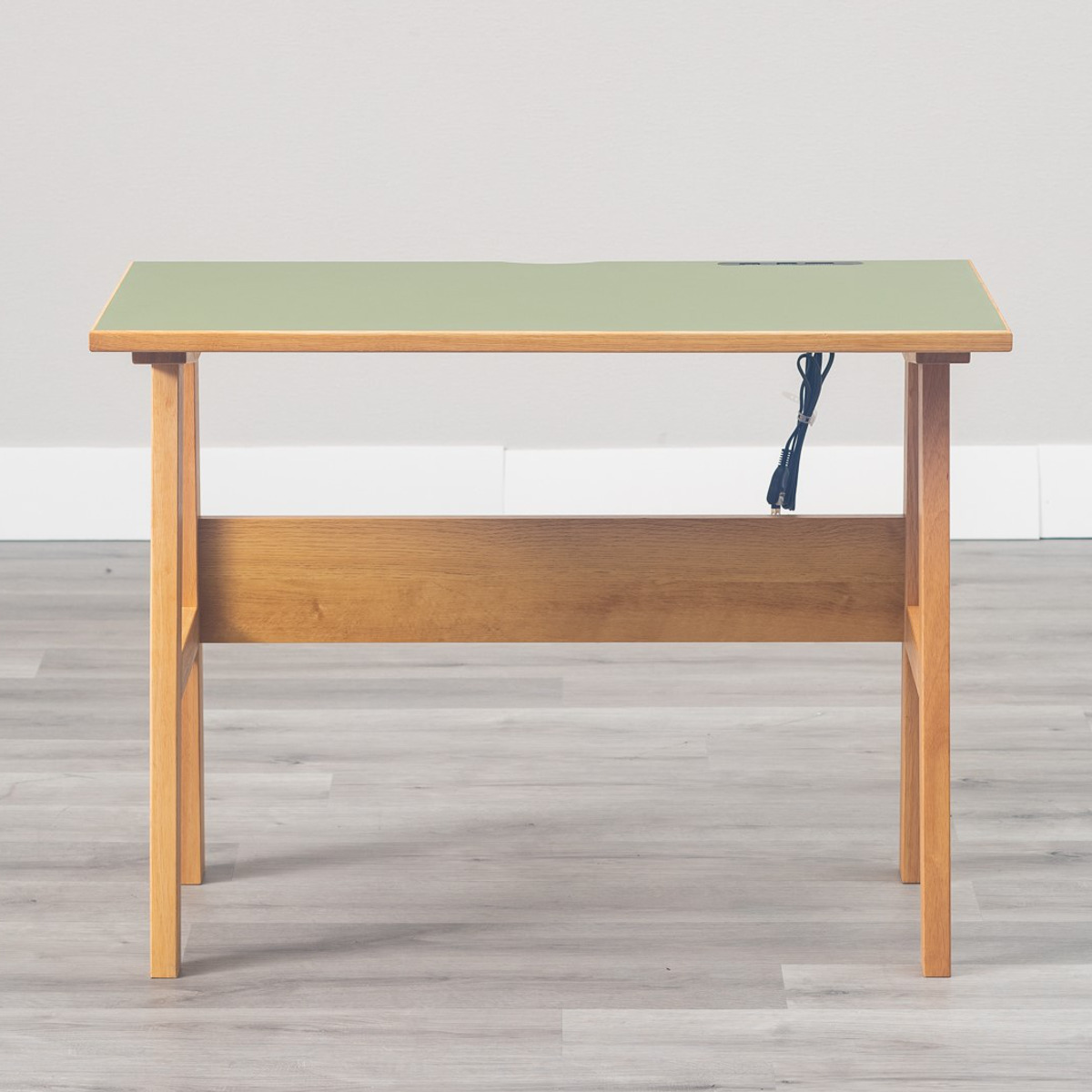 天板には天然素材のリノリウムとオーク無垢材を使用しています。リノリウムとは、亜麻仁油や石灰石、木粉などの天然素材を主原料とした床材で、環境に優しく、抗菌性や抗ウイルス性も期待できる素材です。