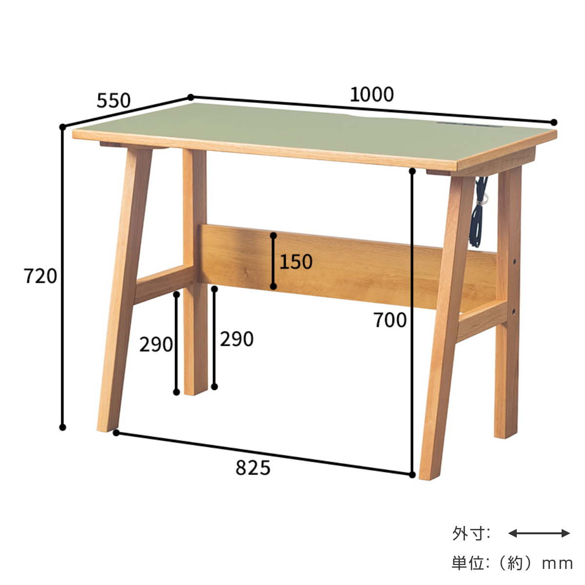 天板は幅100cm×奥行55cmの広々設計。お勉強に必要な教科書やノートを広げても十分に余裕のあるサイズです。