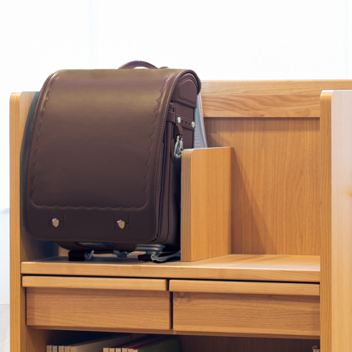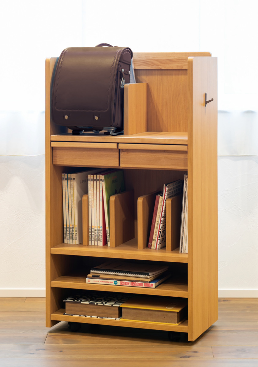 ランドセルと学校教材をまとめて収納できるランドセルラックです。奥行きがコンパクトなので、リビングにも置きやすいサイズです。家族で一緒に楽しみながら学習することでやる気がアップします。