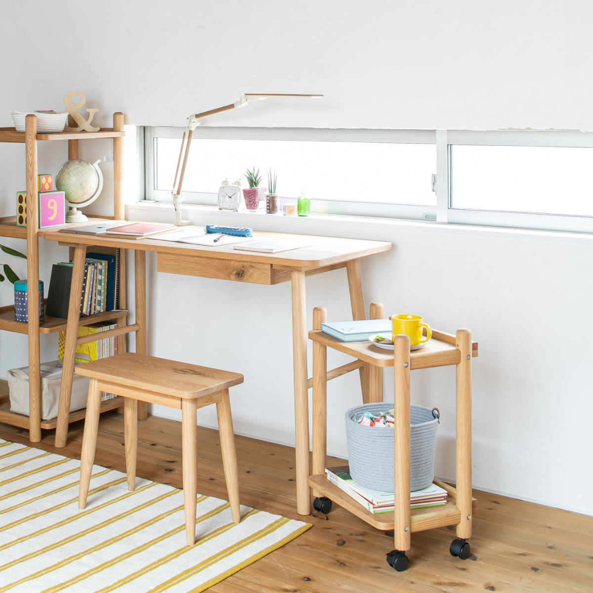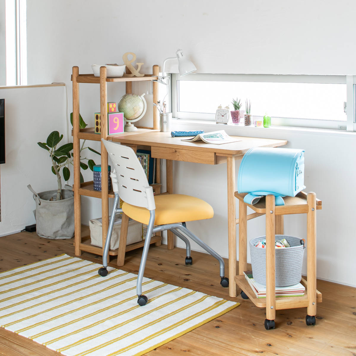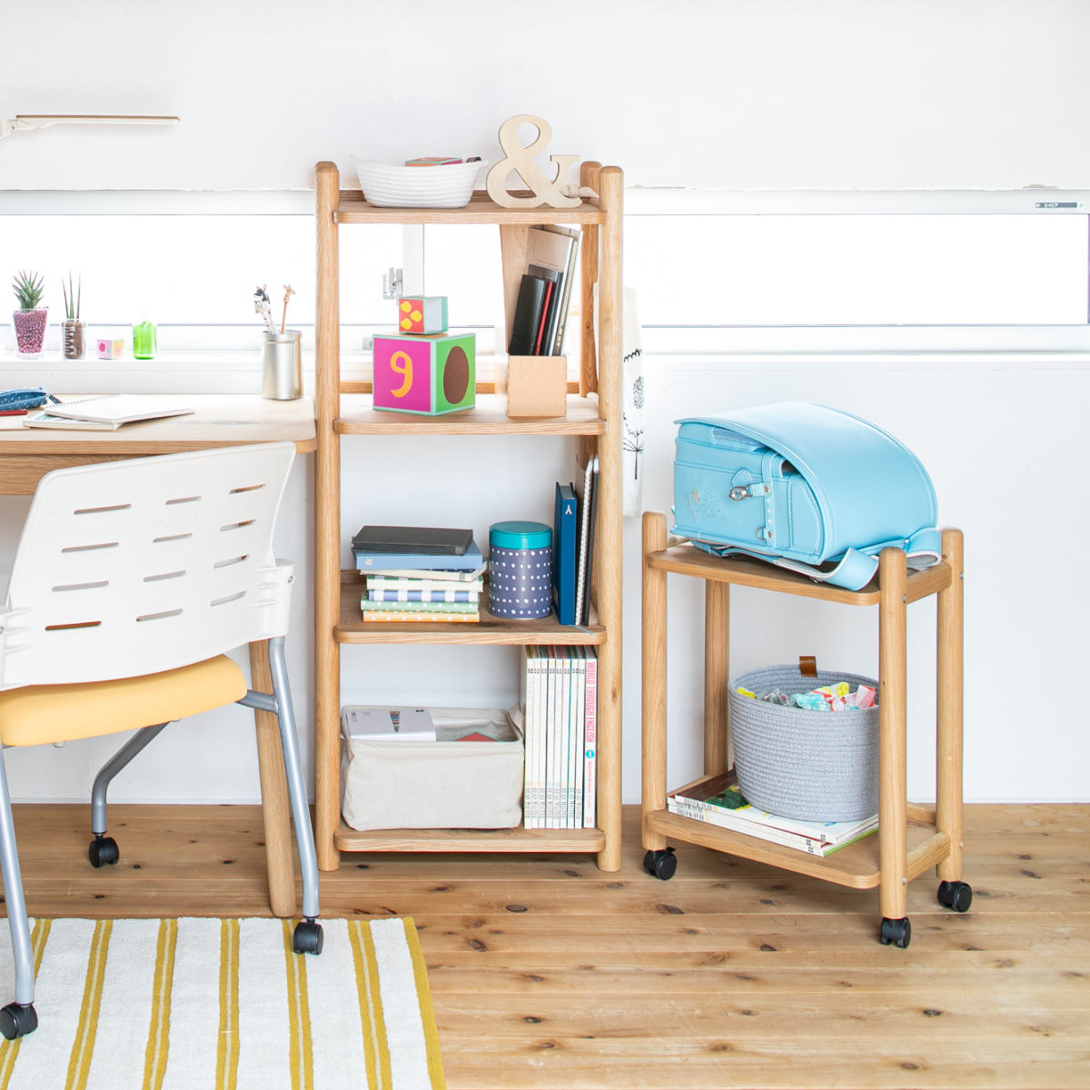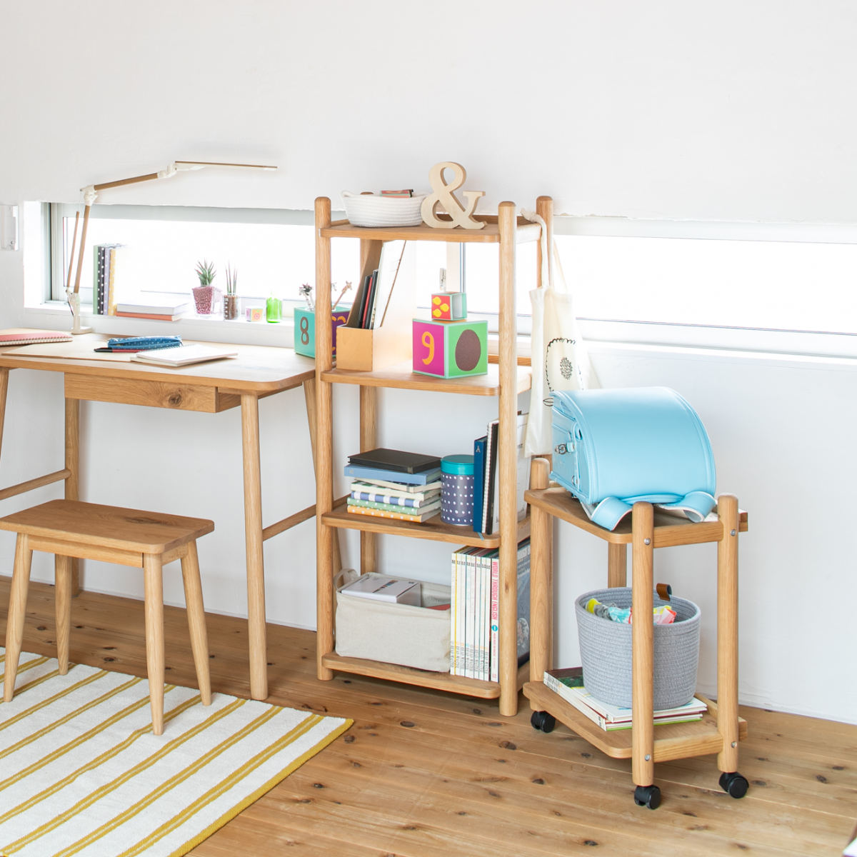 温かみのあるオーク無垢材を贅沢に使用したデスクワゴンです。ランドセルと学習教材などをまとめて置くことができます。シンプルなデザインのため、年齢や性別を問わずお使いいただけます。