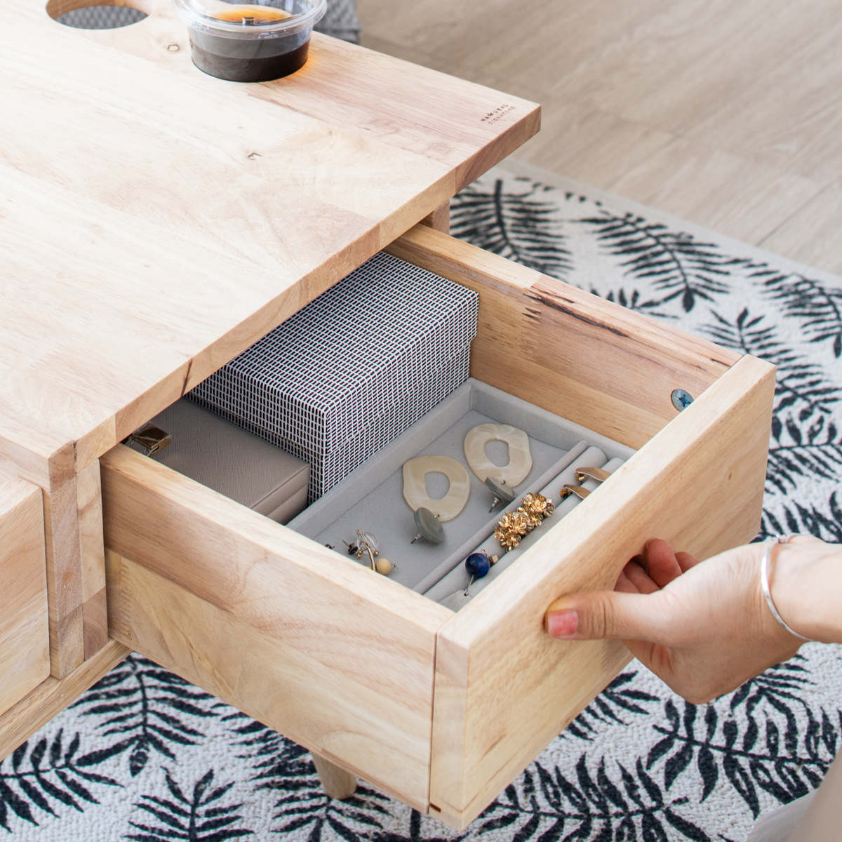 ドレッサーに大切な収納。化粧水、乳液などのメイク道具、アクセサリーまでしっかり入る収納力を備えました。