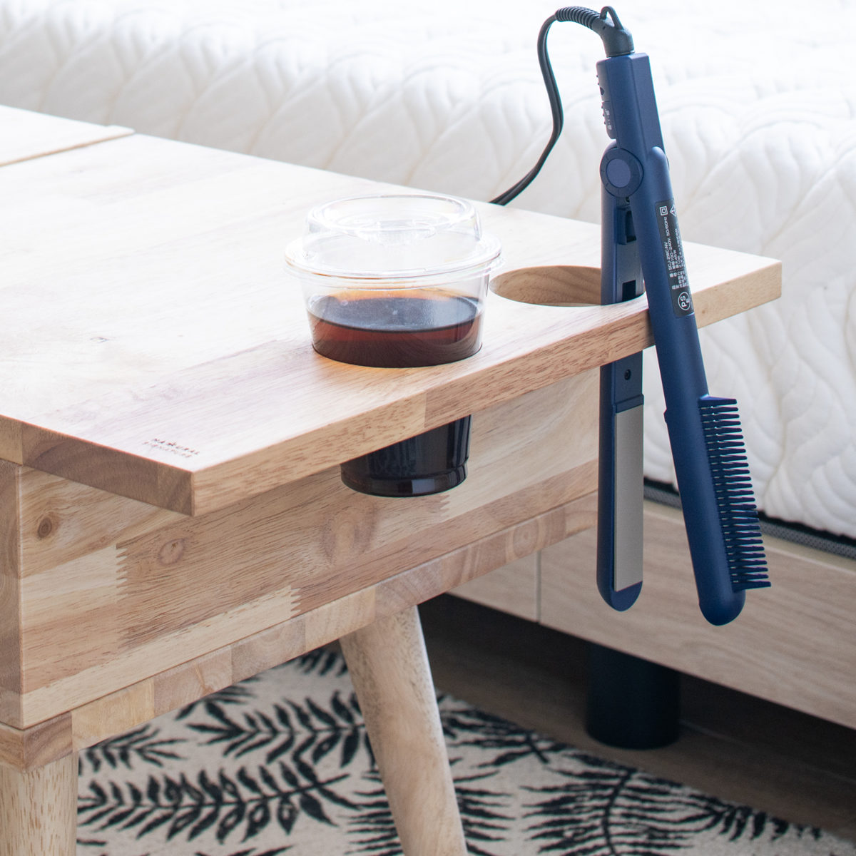 天板には、飲みかけのドリンクやドライヤーを収めるホルダー付きです。