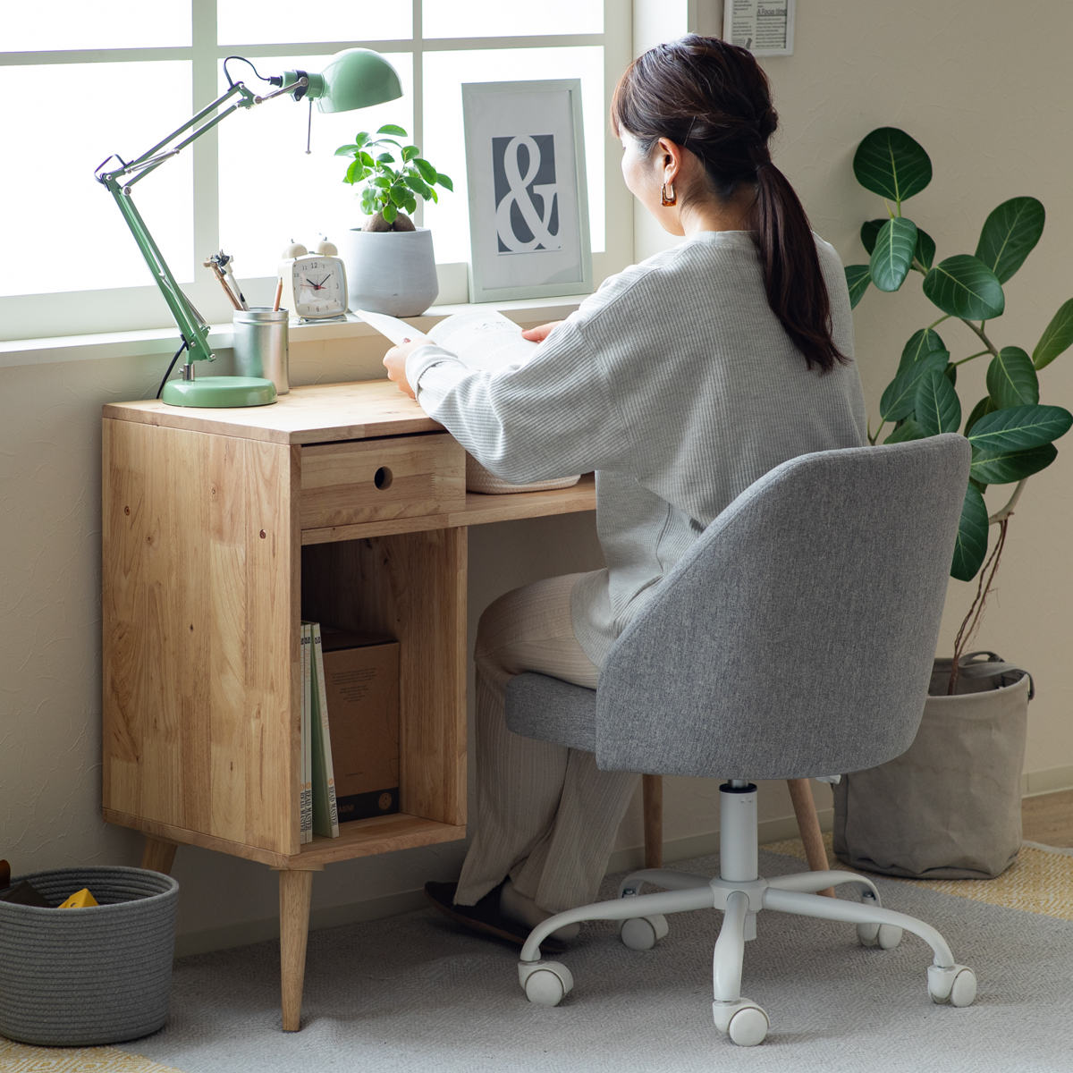使い込む程に味が出てくるラバーウッド無垢材の質感、飽きのこないシンプルで機能的なデザインのワークデスクです。コンパクトサイズなので狭いスペースでもすっきり収まります。