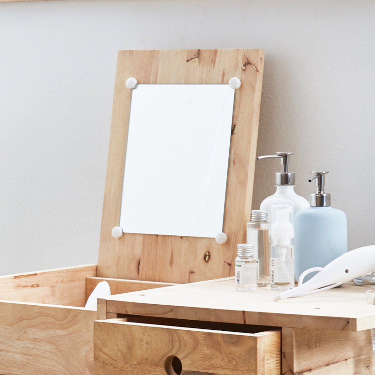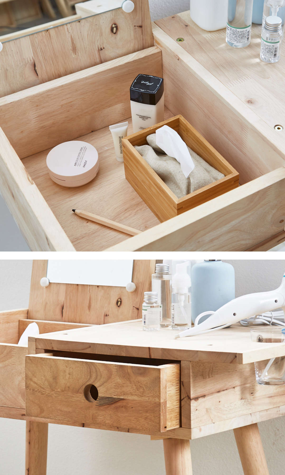 天板下と引出しの2つの収納。コンパクトなサイズですが、メイク道具、お気に入りの小物などをたっぷり収納できます。