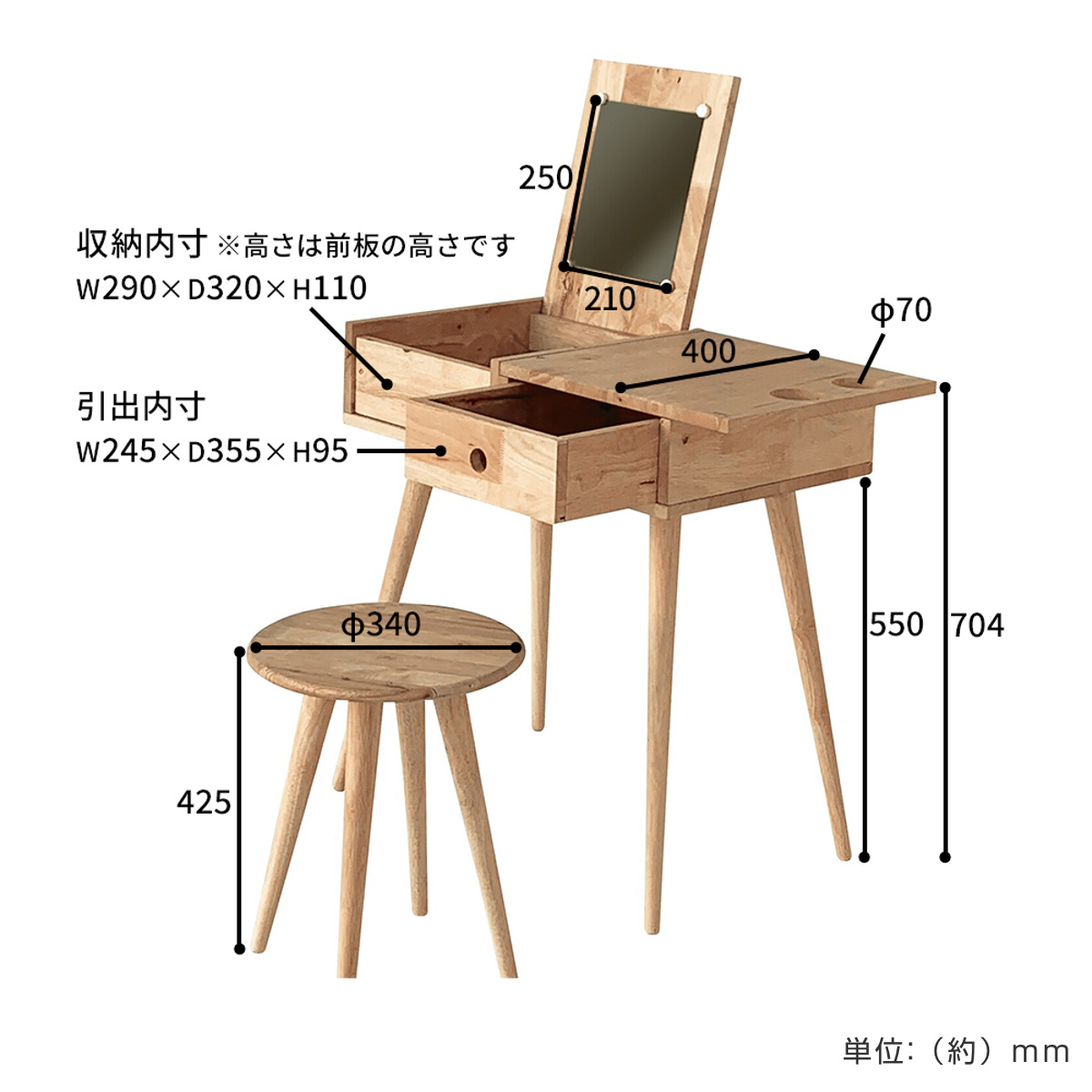 ドレッサー チェアセット ドライヤーホルダー付 NATURAL SIGNATURE ( デスク 机 鏡台 化粧台 木製 天然木 引き出し 鏡 ミラー 椅子 スツール ワークデスク コスメ メイク台 収納付き コンパクト ドリンクホルダー リビングデスク )