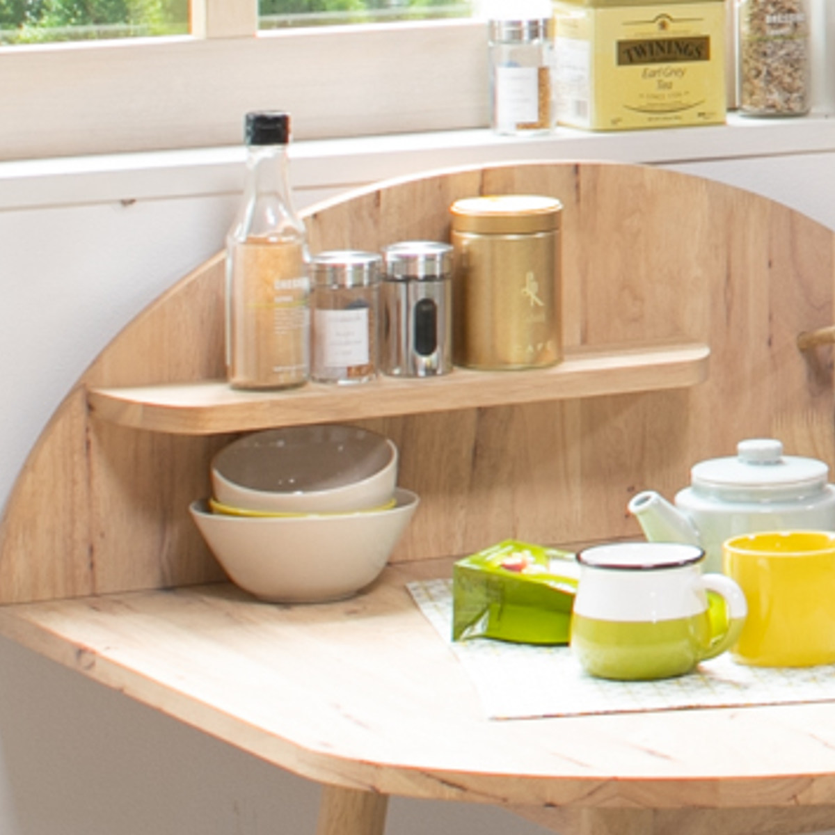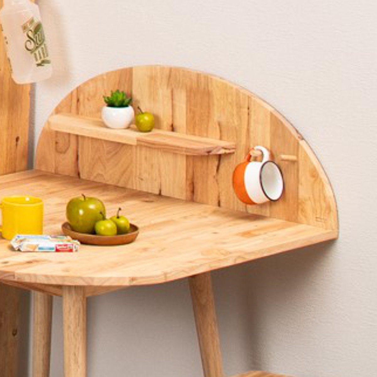 壁付けにぴったりな半円型のやさしいデザイン。来客時には椅子を足して3人で食卓を囲めます。ラバーウッド無垢材のみをふんだんに使った天然木シリーズで、個性豊かな木目が楽しめます。