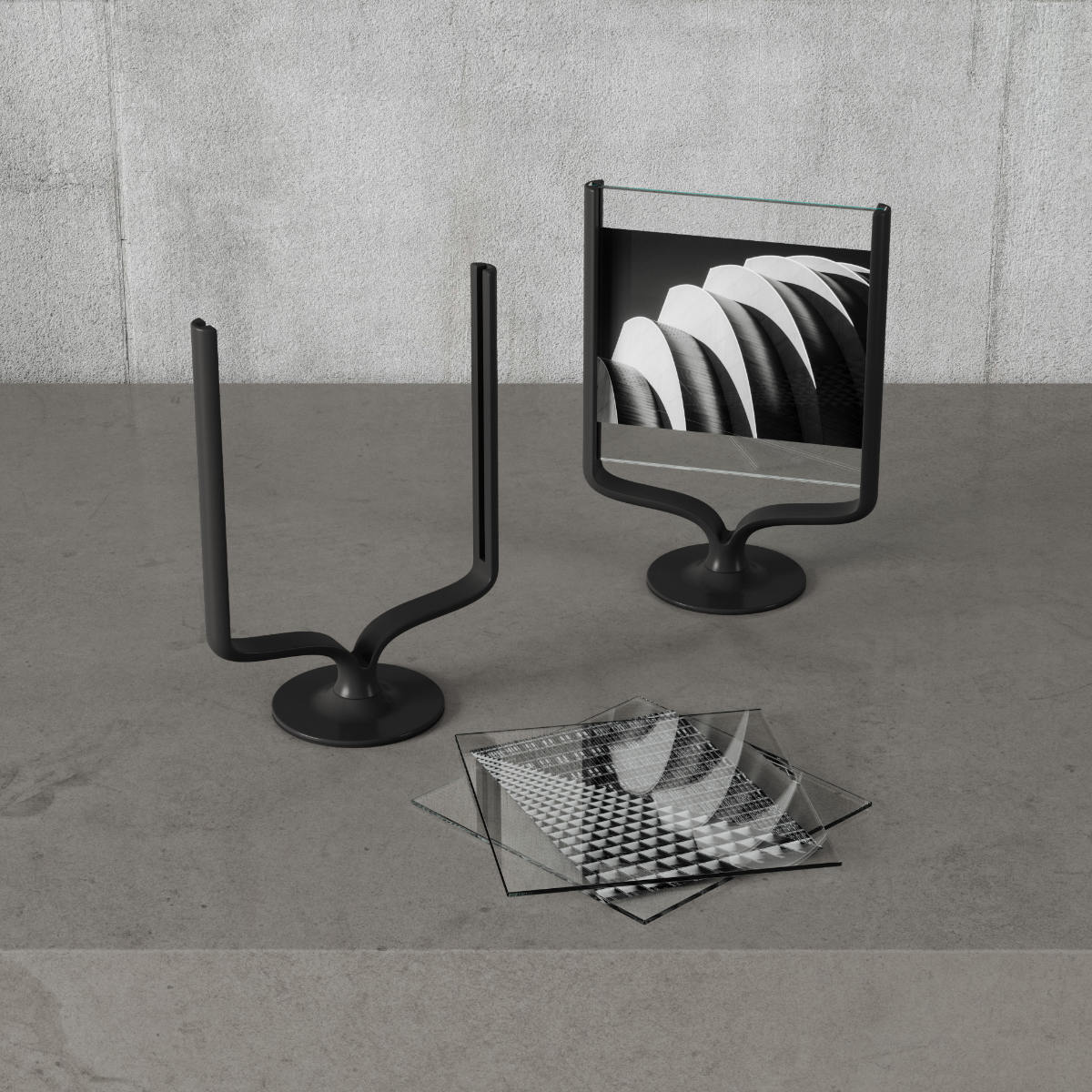 洗練されたデザインでどんな空間も簡単にワンランクアップさせる彫刻的なフォトディスプレイです。トロフィーをイメージしたデザインは360度どの角度から見ても美しく、フレームの両面に写真を飾れます。