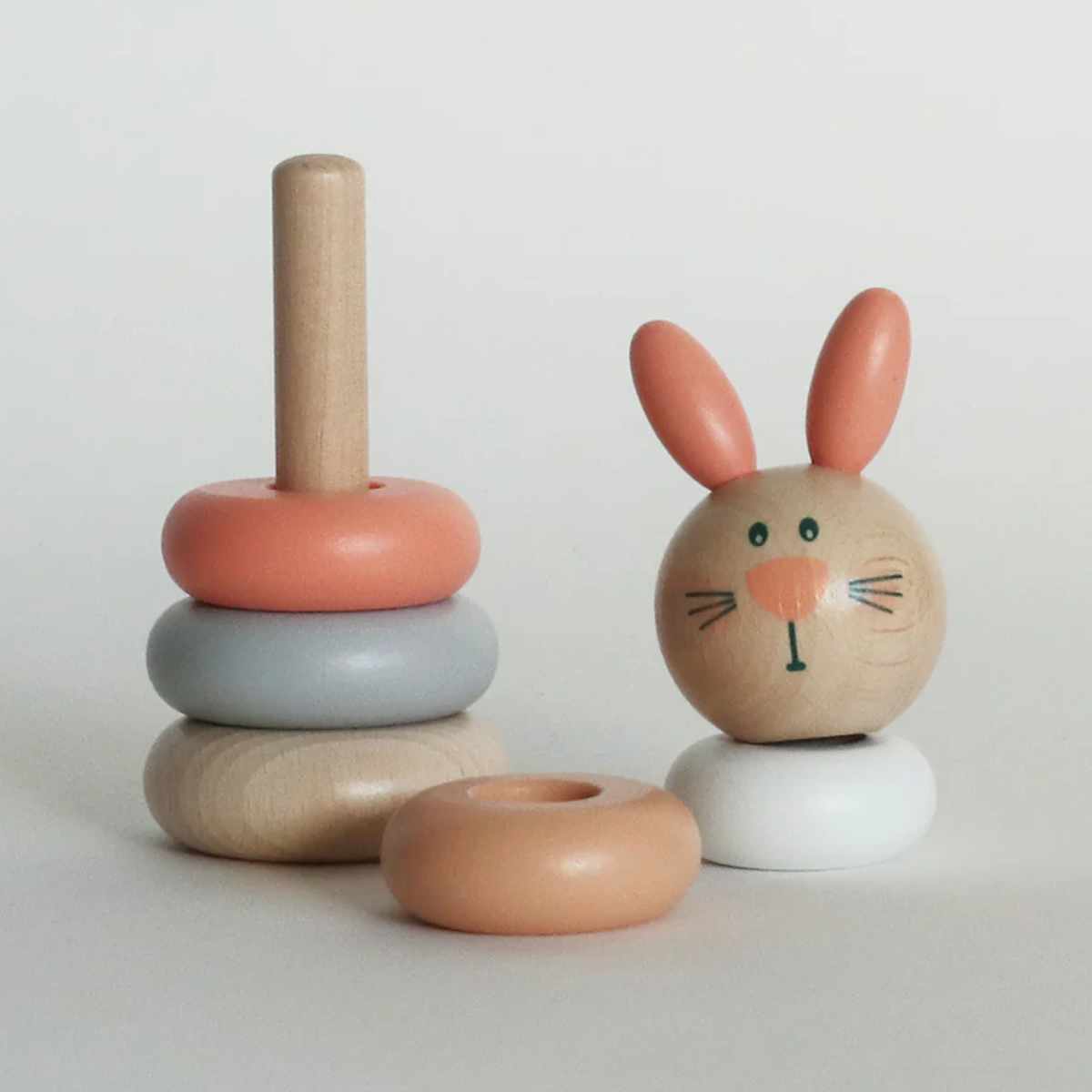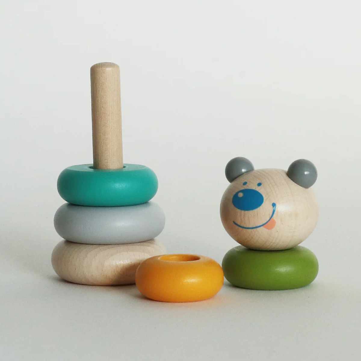 5つの丸いパーツを組み合わせて、積み重ねることで形が変化するスタッキングトイです。丸いフォルムのなめらかな手触りで、小さなお子様でも安心して遊べます。出産祝いなどのベビーギフトにもピッタリです。