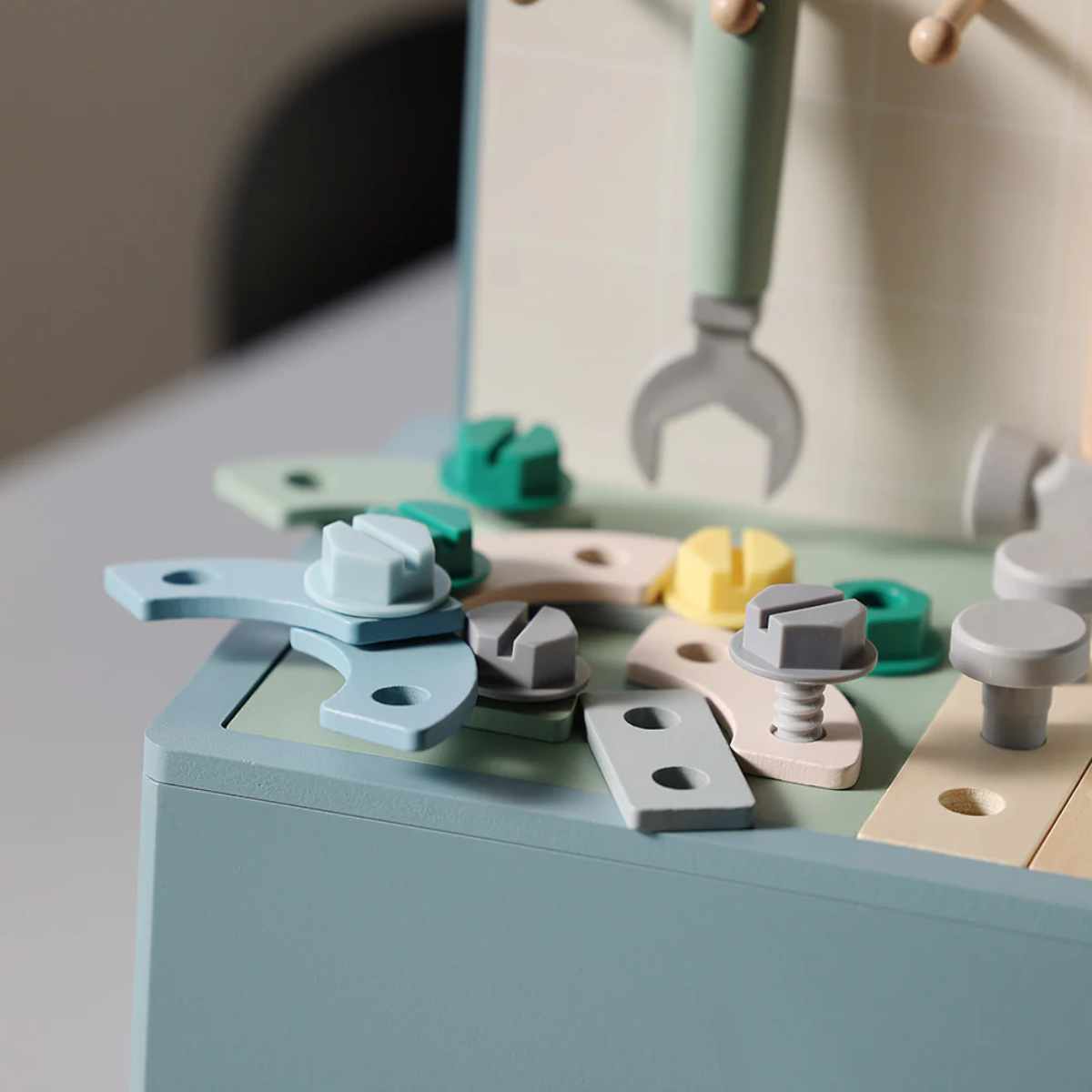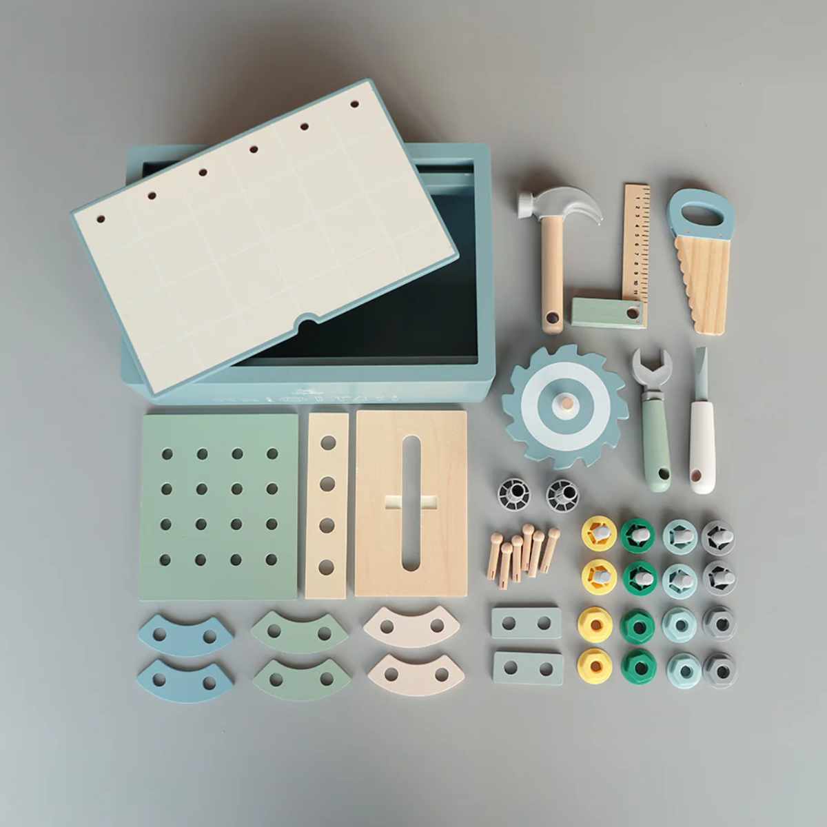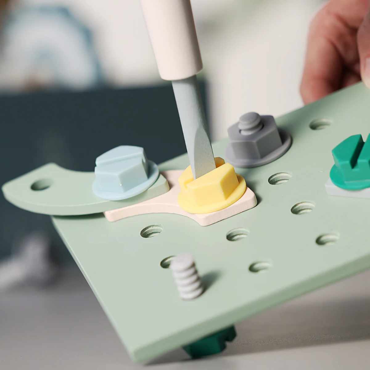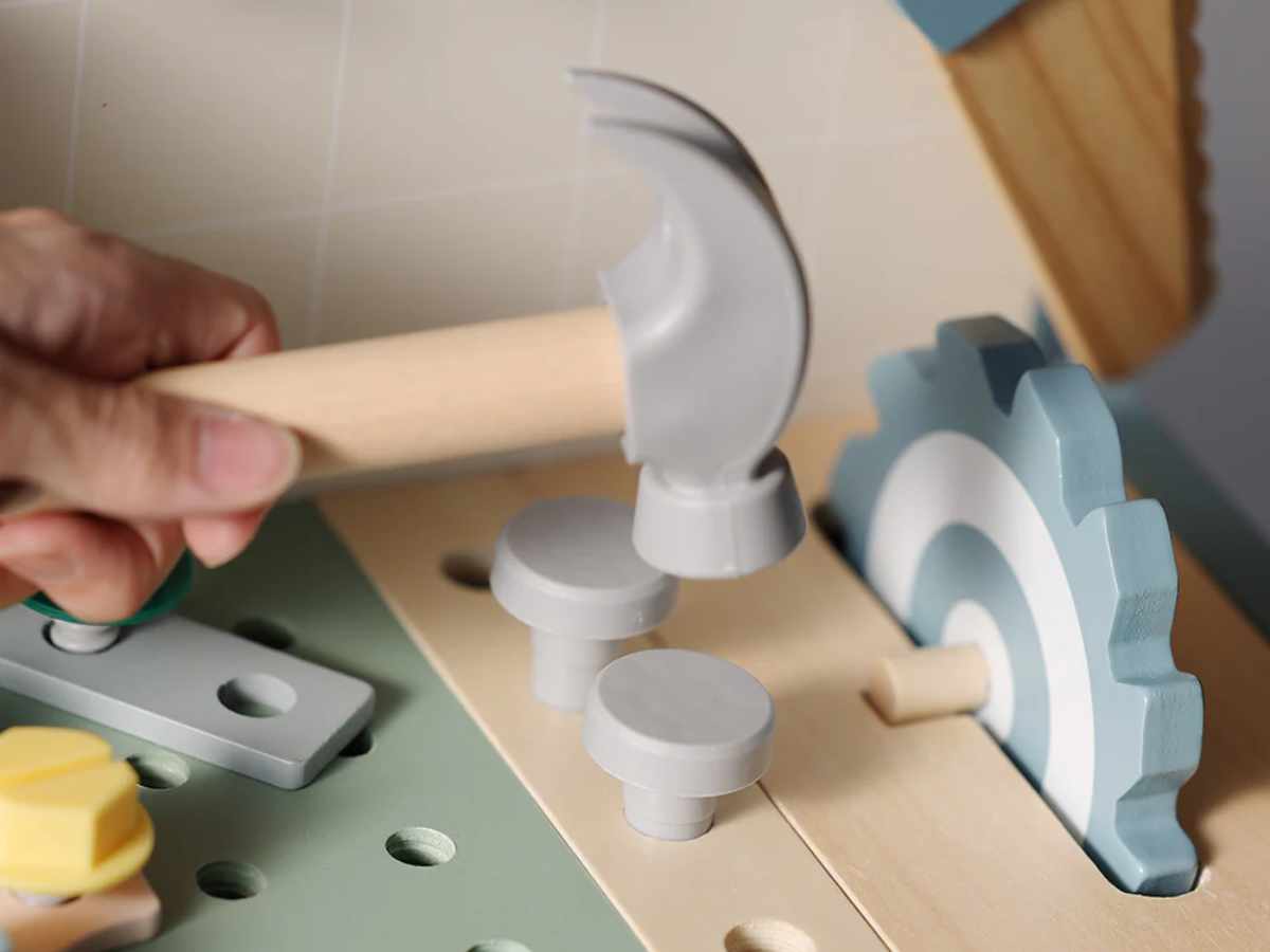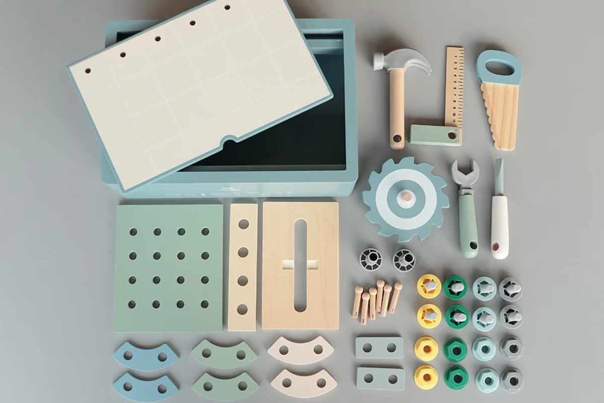 ボルト、ワッシャー、ナット、のこぎりや金槌などのたくさんのパーツを組み合わせて遊ぶことで、好奇心を刺激しながら、豊かな想像力を育む効果が期待できます。