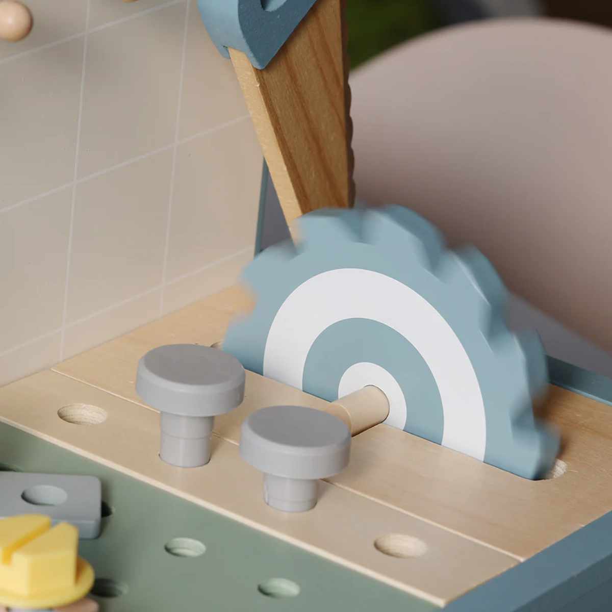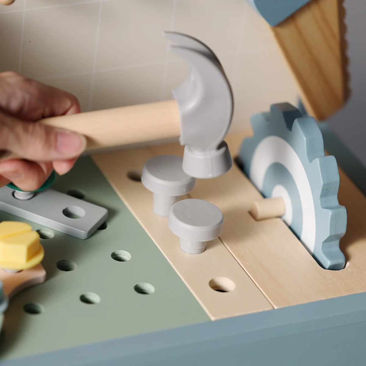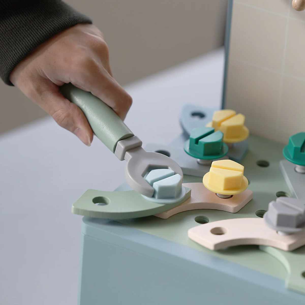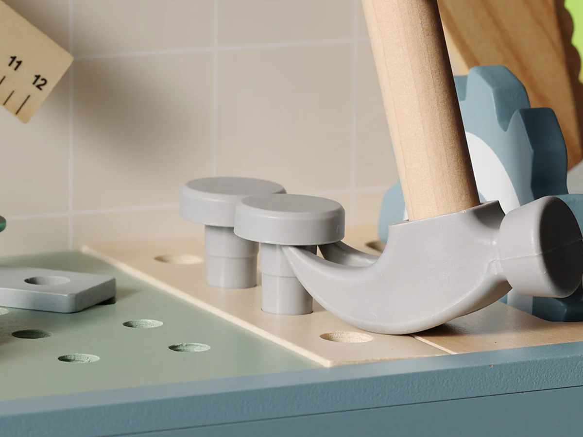 ボルト、ワッシャー、ナット、のこぎりや金槌などのたくさんのパーツを組み合わせて遊ぶことで、好奇心を刺激しながら、豊かな想像力を育む効果が期待できます。