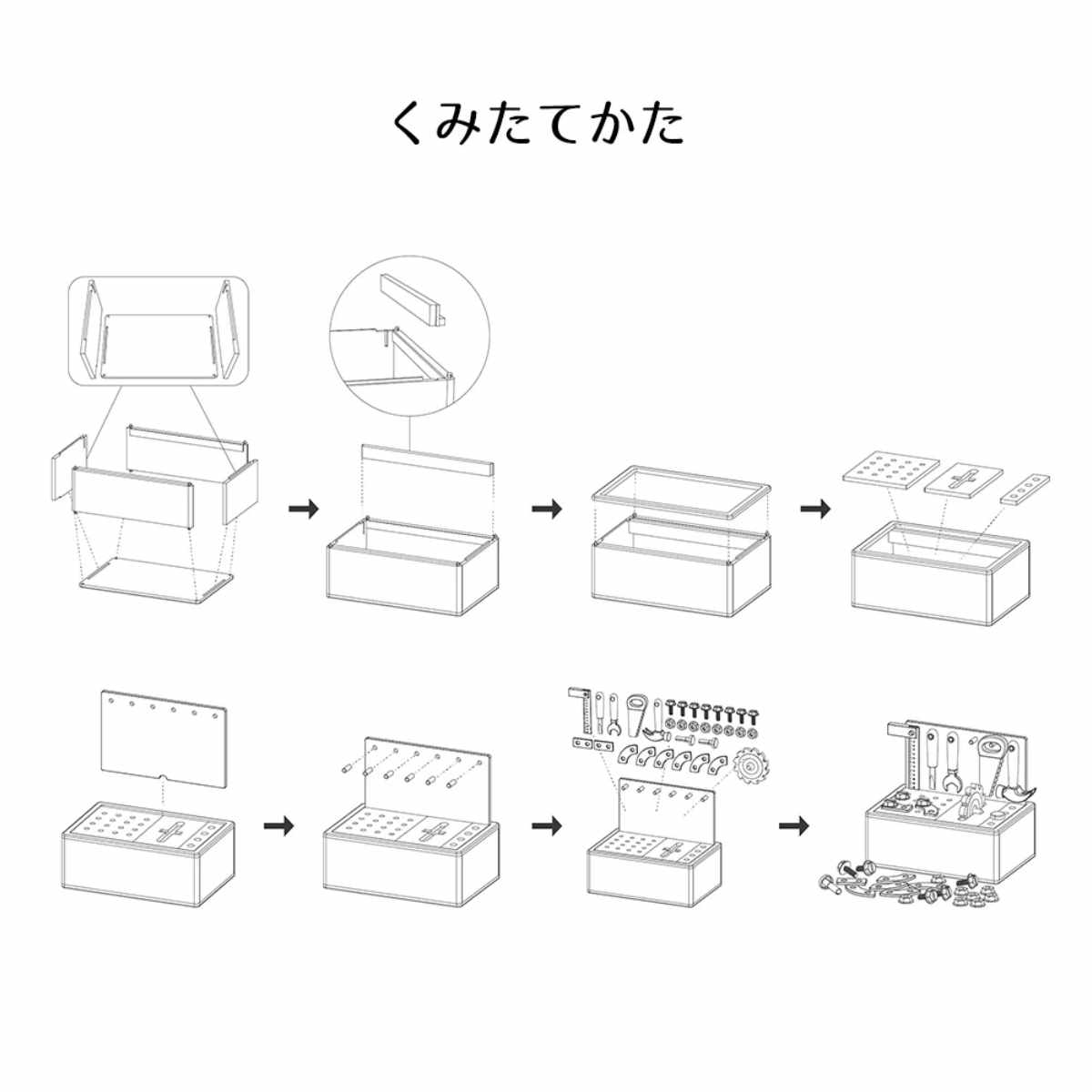 ボックスの中からネジやレンチ、ものさしなどのパーツを取り出してクラフトボックスの組み立てを楽しめます。