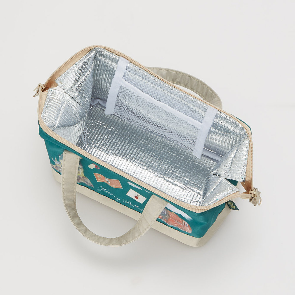 内側はアルミ蒸着素材で保冷バッグとしてお使いいただけます。また、メッシュポケットが内側に付いており、保冷剤入れとしても使えるほか、小物やお菓子などの小さなものを入れておくのに便利です。