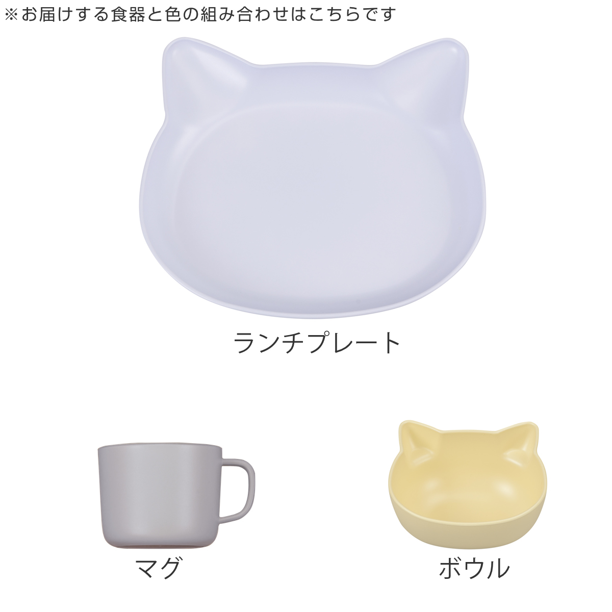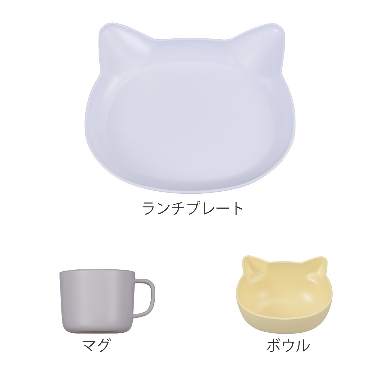 猫のお顔デザインがかわいい子ども用食器です。大人の食器と一緒に食卓に並べてもやさしく馴染むパステルカラーも魅力です。 抗菌加工により、衛生的にお使いいただけます。