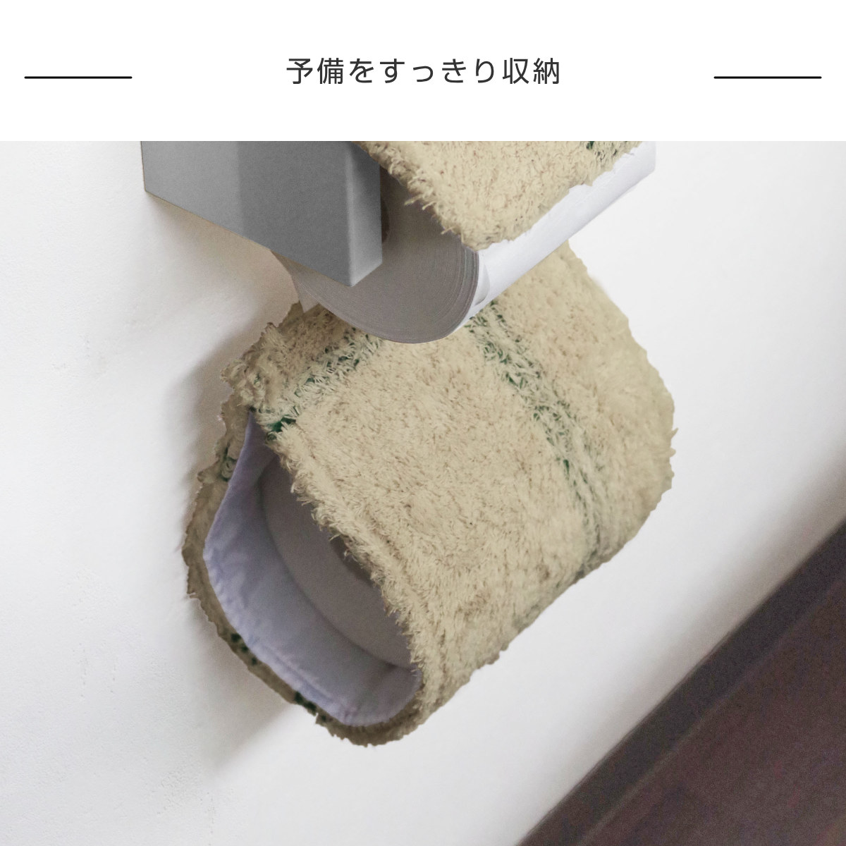 ペーパーホルダーの下に、トイレットペーパーを1ロール収納できます。いつでも予備を用意しておけるので、必要なときにサッと取り換えられて便利です。