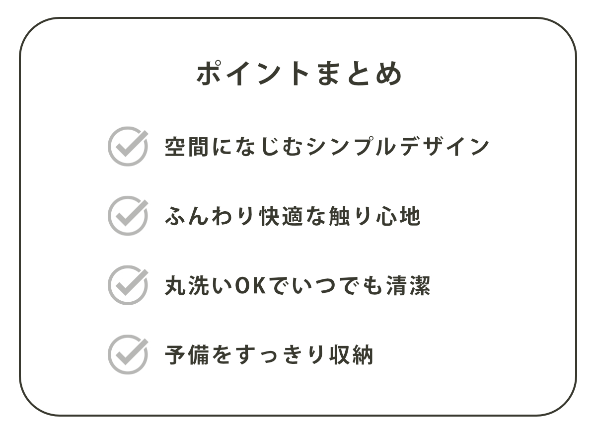 洗濯機で丸洗いできるタイプのため、汚れが気になったときはすぐにお手入れ可能です。清潔な状態を保てるので、いつでも安心してお使いいただけます。