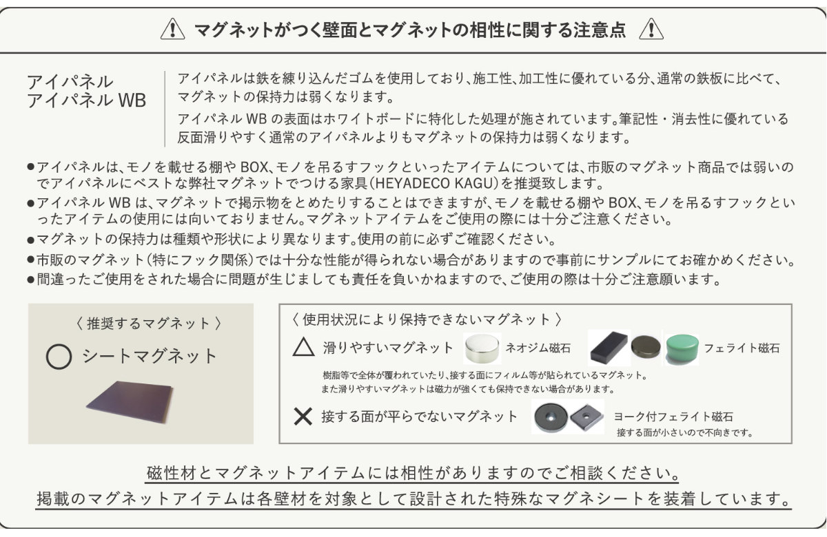 | 注意事項 | ※アイパネルWBの表面はホワイトボードに特化した処理が施されており、筆記性・消去性に優れている反面滑りやすく、マグネットの保持力は弱くなります ※商品ページ内には別の商品を含む画像を使用しています |