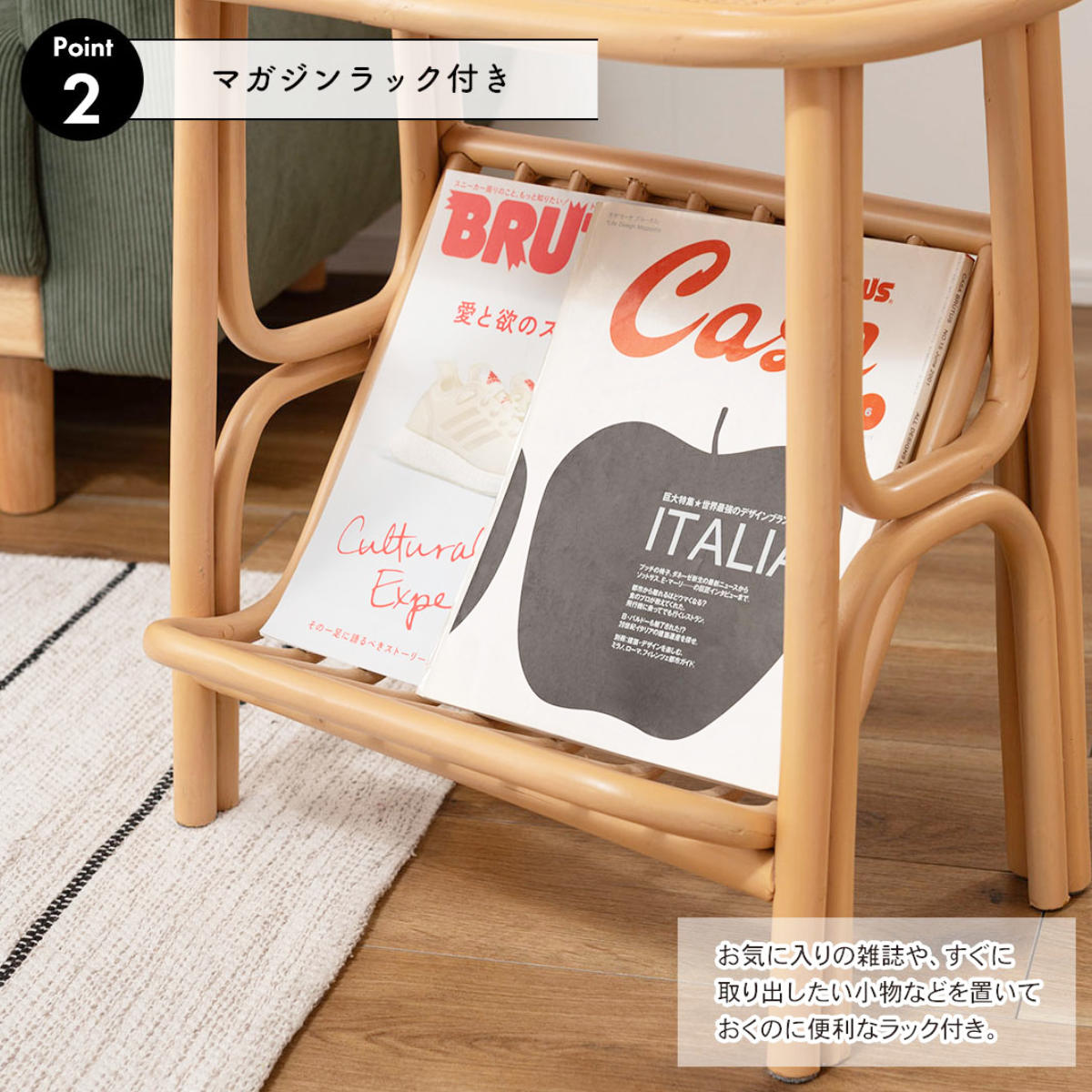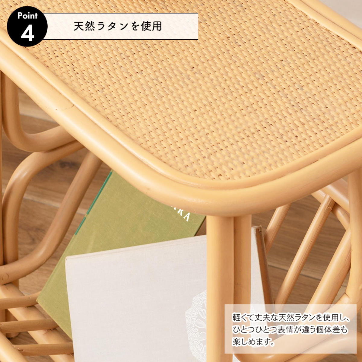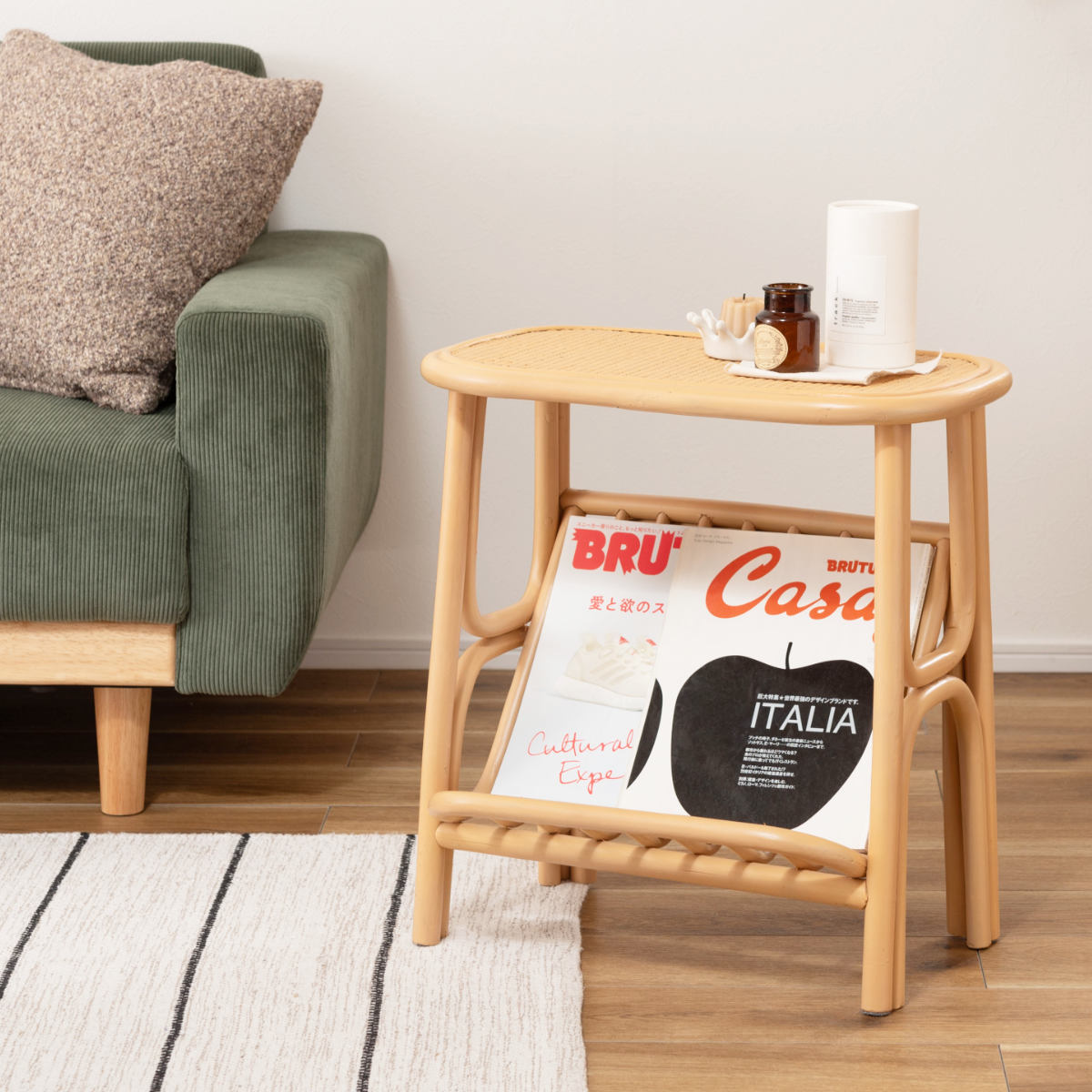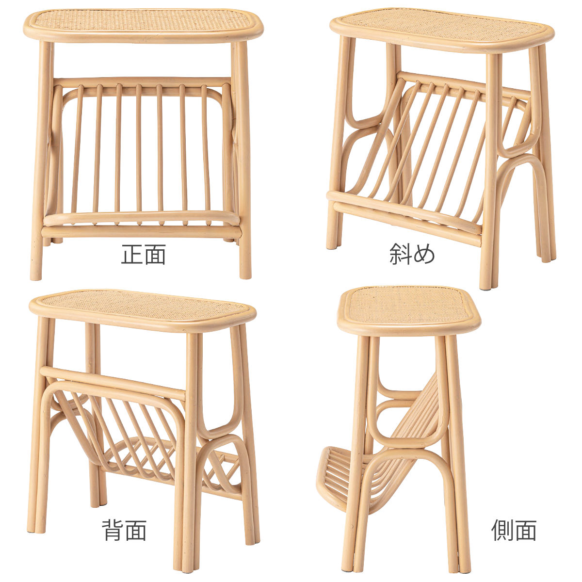 天然ラタンを使用した曲線が美しい、マガジンラック付サイドテーブルです。角丸仕様のフォルムは、お部屋にやさしい印象を与えます。天然ラタンは、ひとつひとつ個体差があり、違った表情を楽しめます。