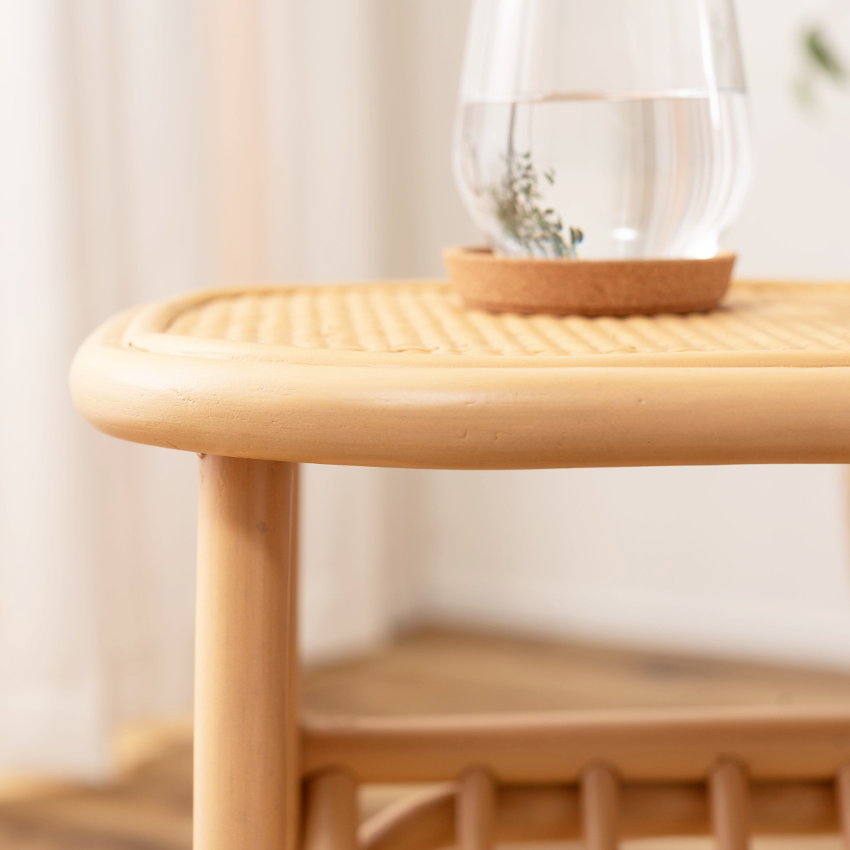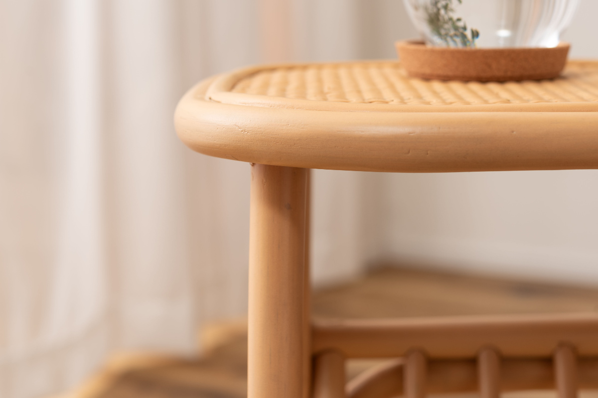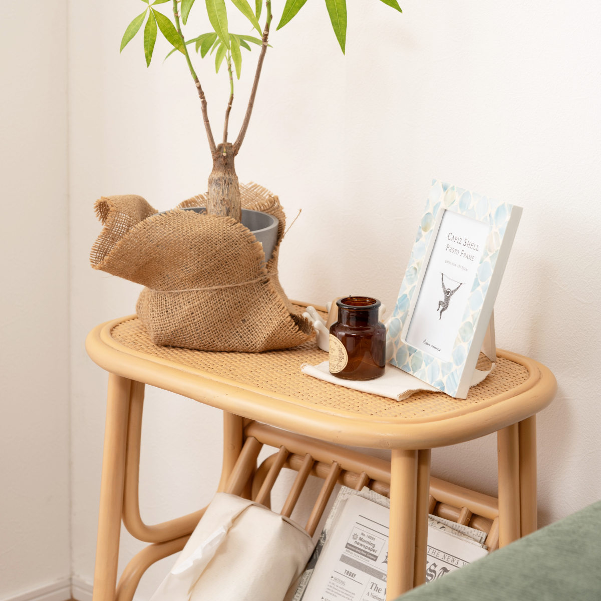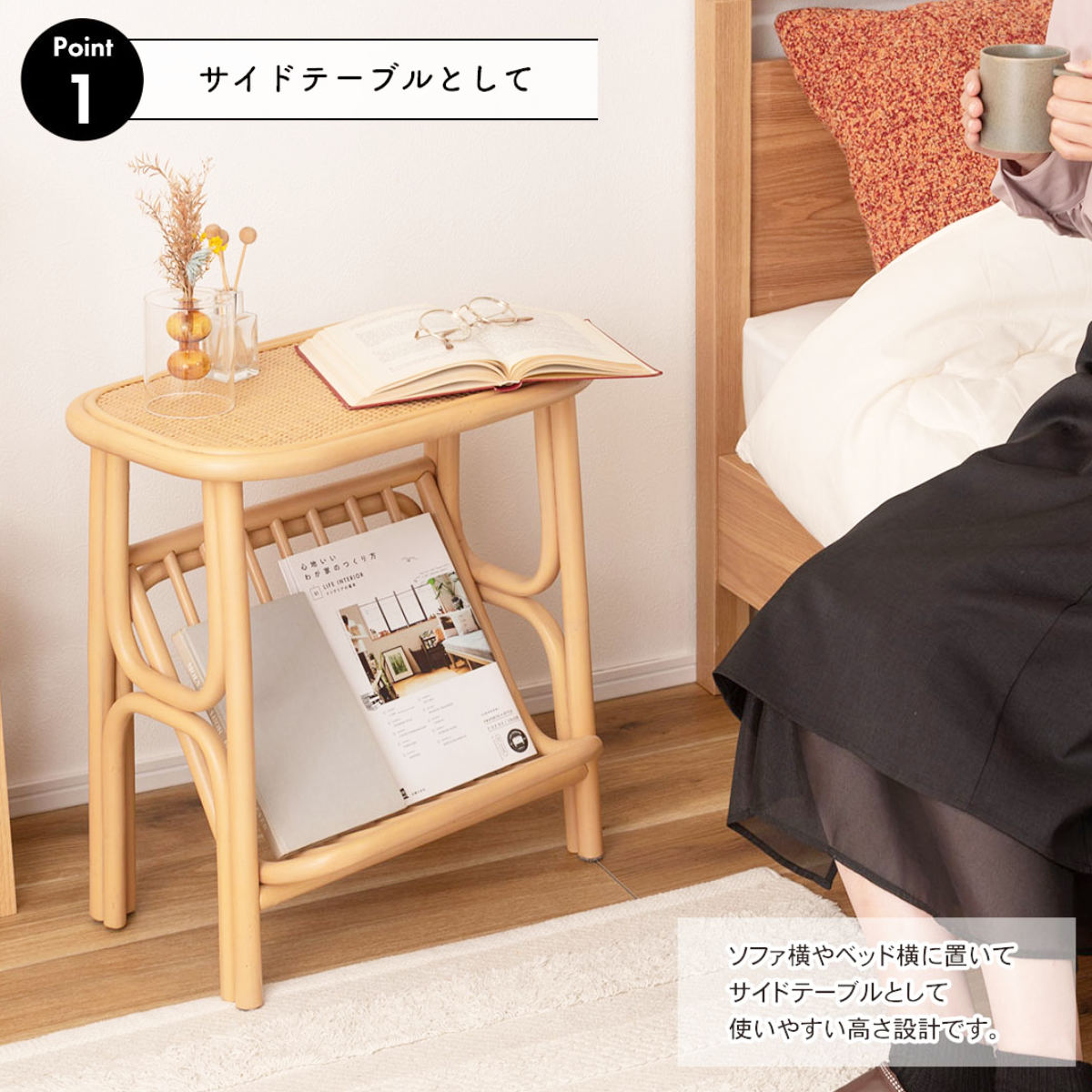 天然ラタンを使用した曲線が美しい、マガジンラック付サイドテーブルです。角丸仕様のフォルムは、お部屋にやさしい印象を与えます。天然ラタンは、ひとつひとつ個体差があり、違った表情を楽しめます。