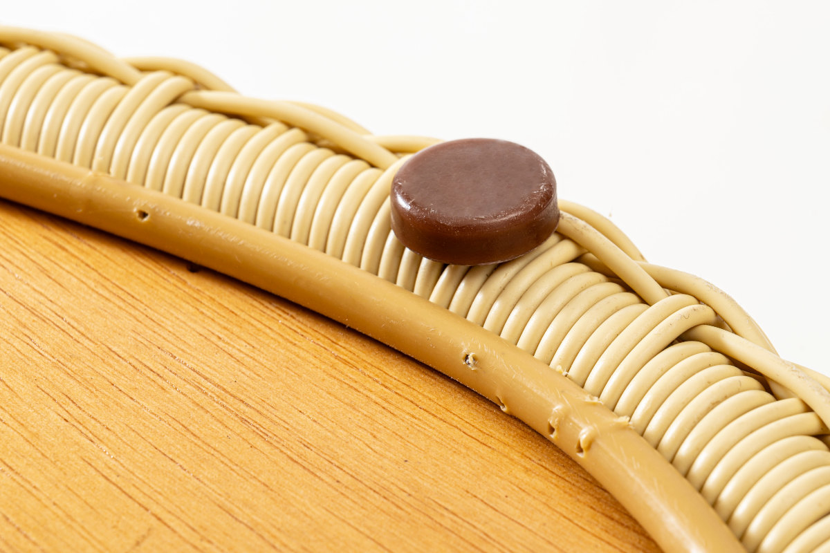 希少価値の高い天然のマホガニーを使用した天板と、ナチュラルな色味の人工ラタンを組み合わせた、リビングテーブルです。人工ラタン(ポリプロピレン)を丁寧に編み込み、曲線を活かした、上品で個性的なビーンズ型のテーブルです。