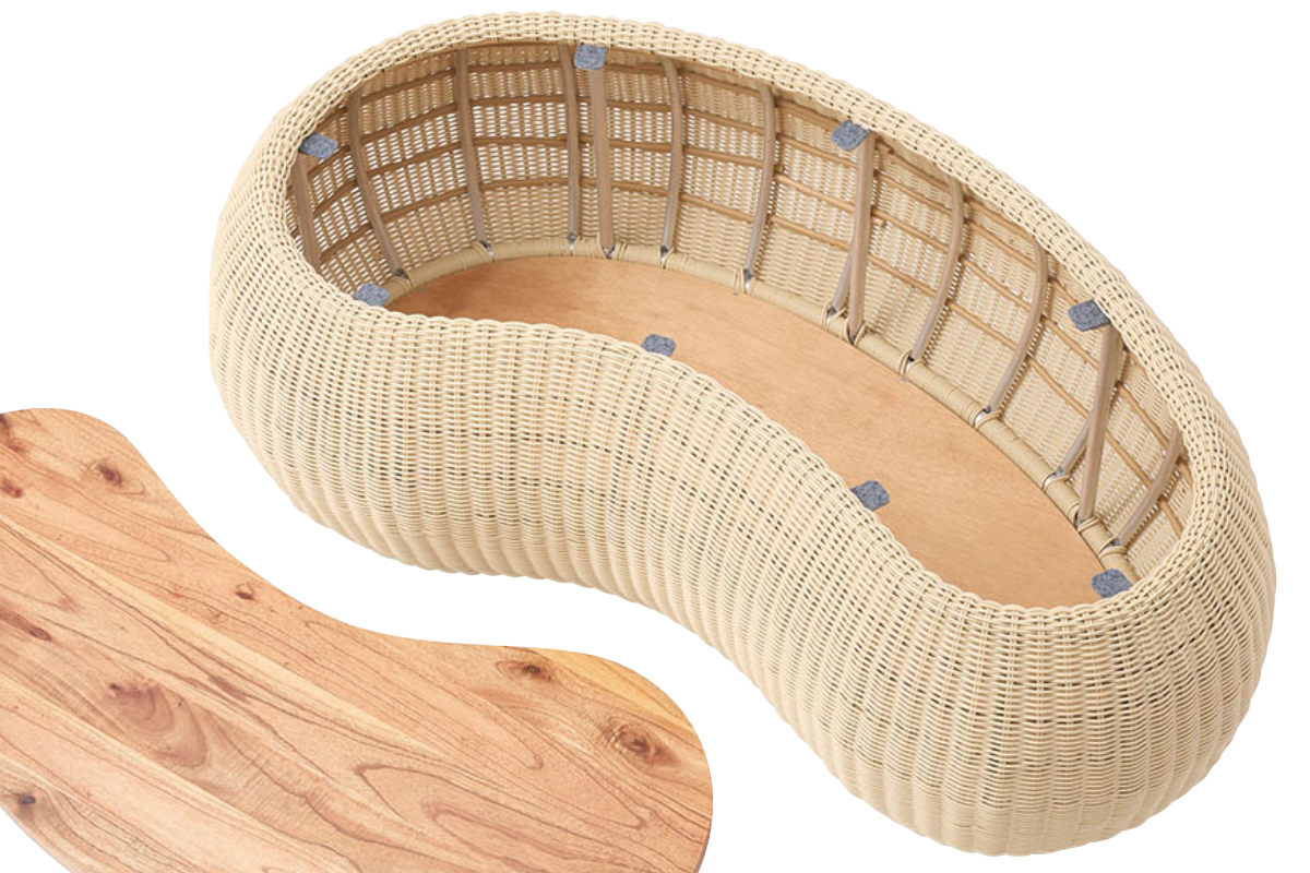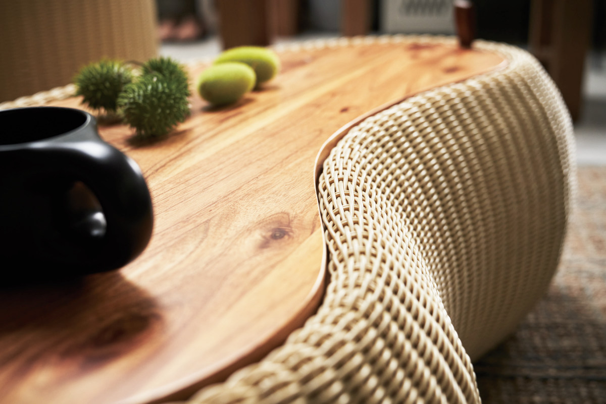 曲線が美しい人工ラタン×天然木のビーンズ型テーブル