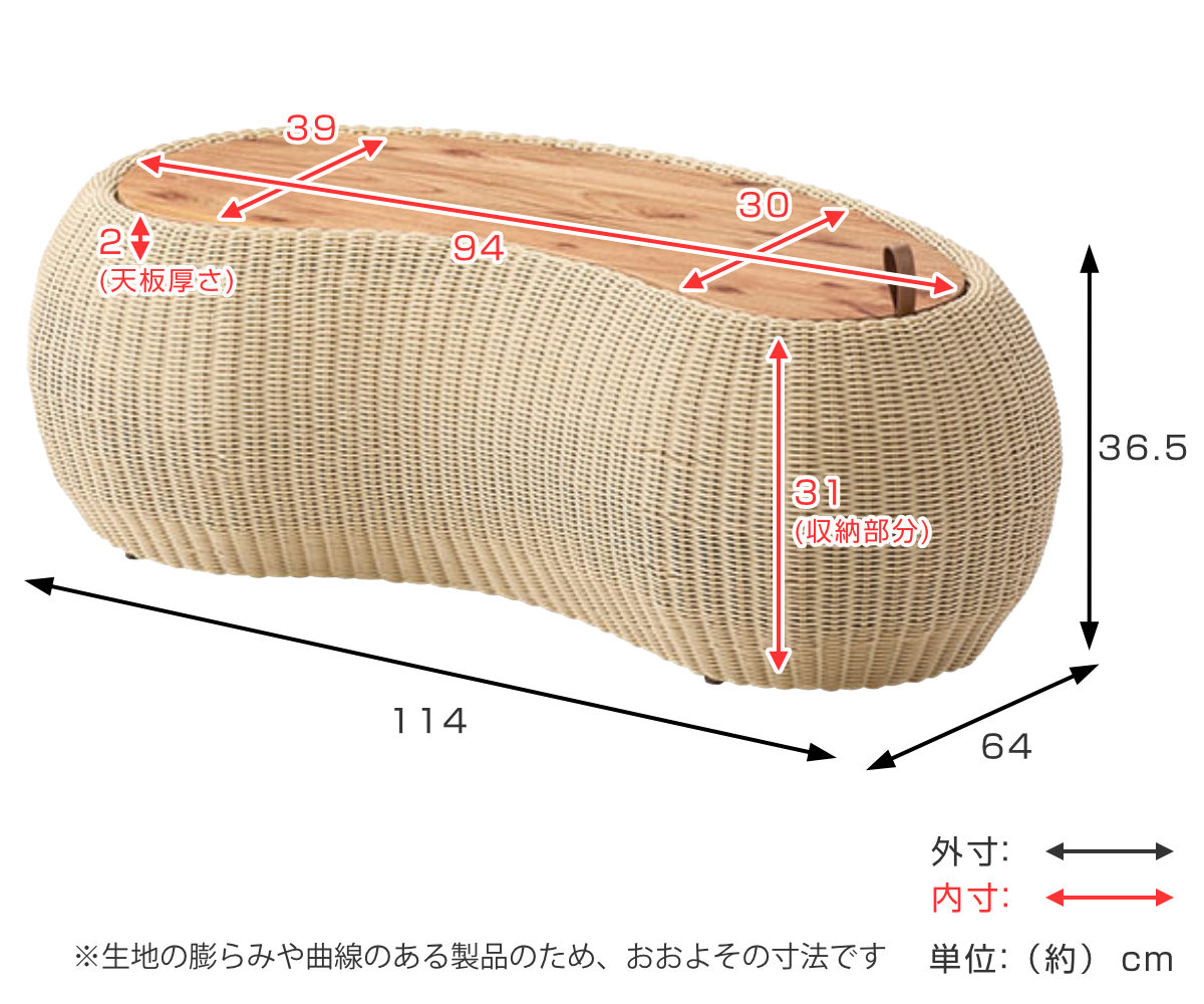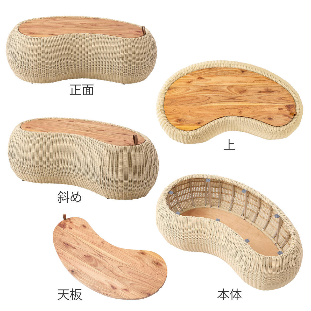 ビーンズ型 センターテーブル 幅114cm ラタン調 ( テーブル リビングテーブル ローテーブル 人工ラタン 収納付き 天然木 カフェテーブル ソファテーブル コーヒーテーブル 天板下収納 木目 おしゃれ リビング 籐 )