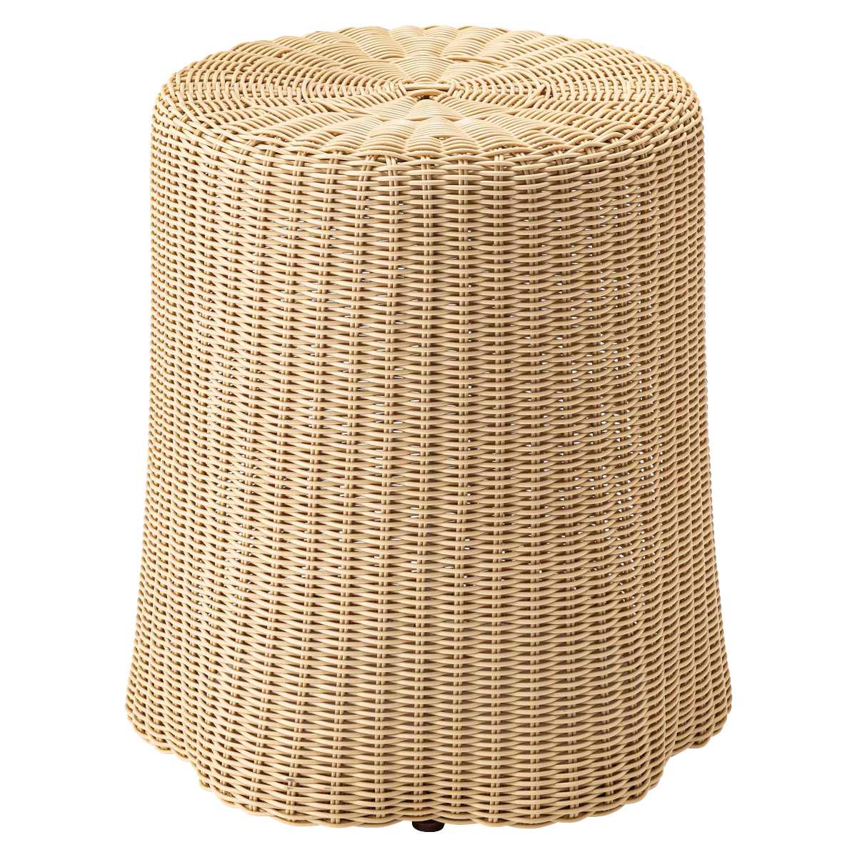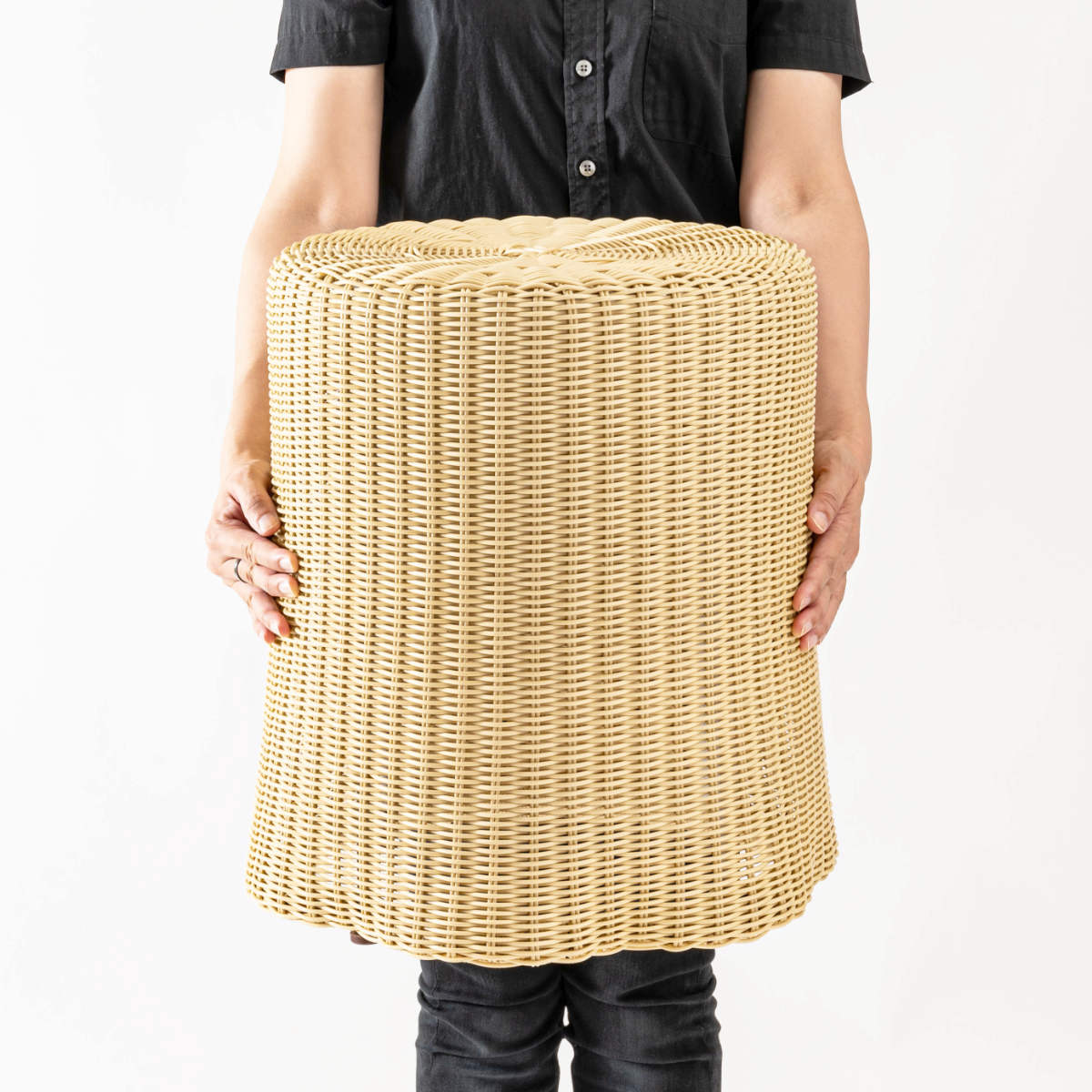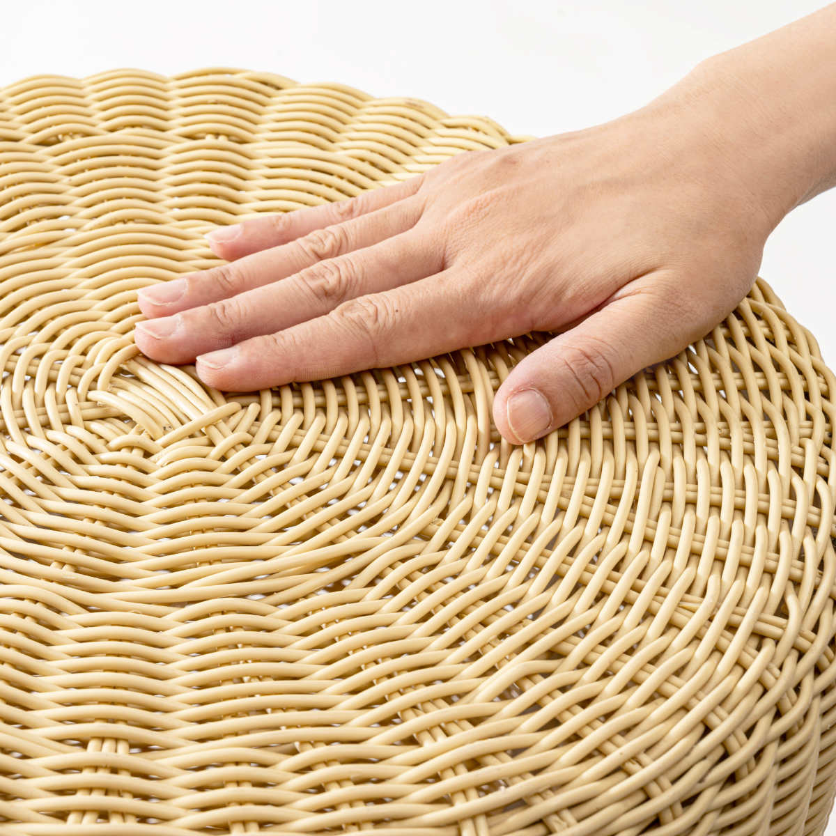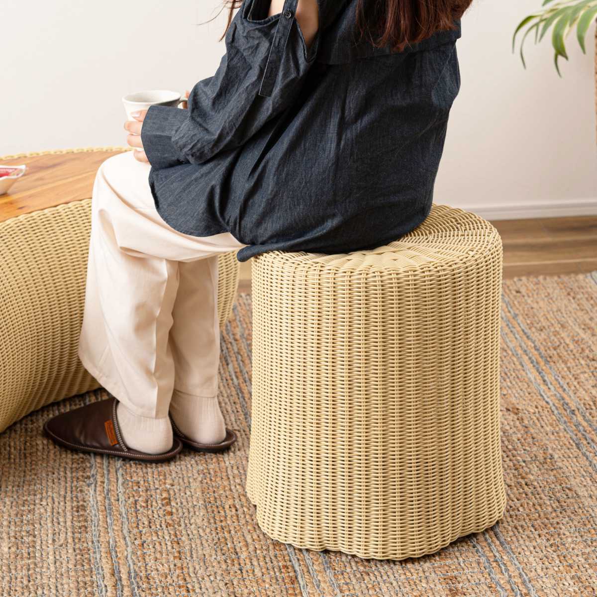 ナチュラルな色味の人工ラタン(PPラタン)を丁寧に編み込み、曲線を活かした、上品で個性的なスツールです。下方向にほのかに広がる形状で、まるで切り株に座って休憩しているよう。安定感があり、ホッと癒されます。また、高めの設計なので、立ち座りの動作がラクにできます。