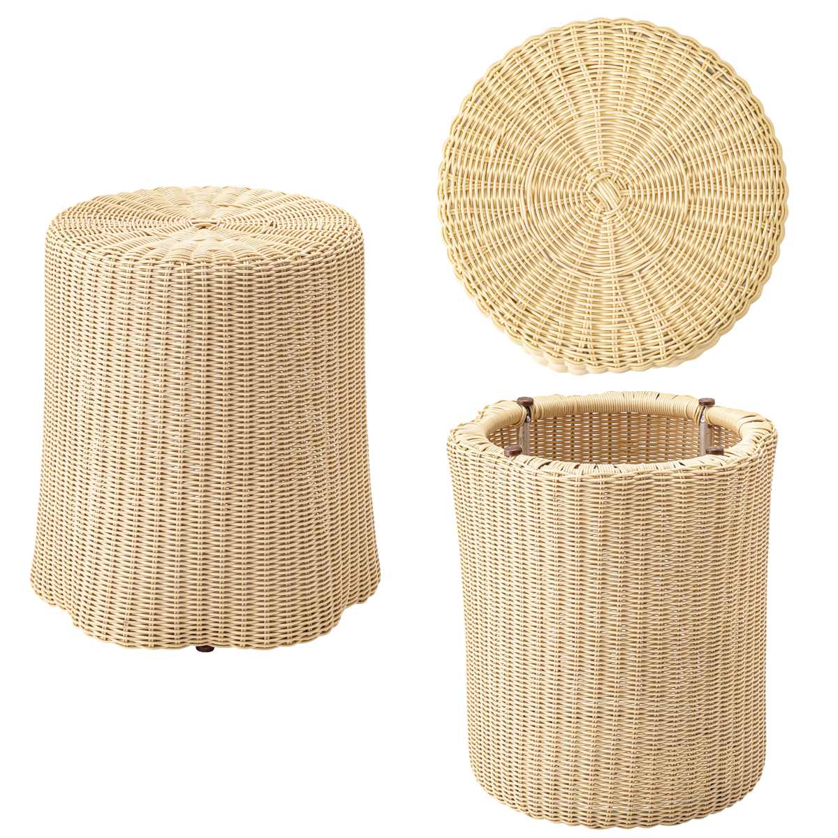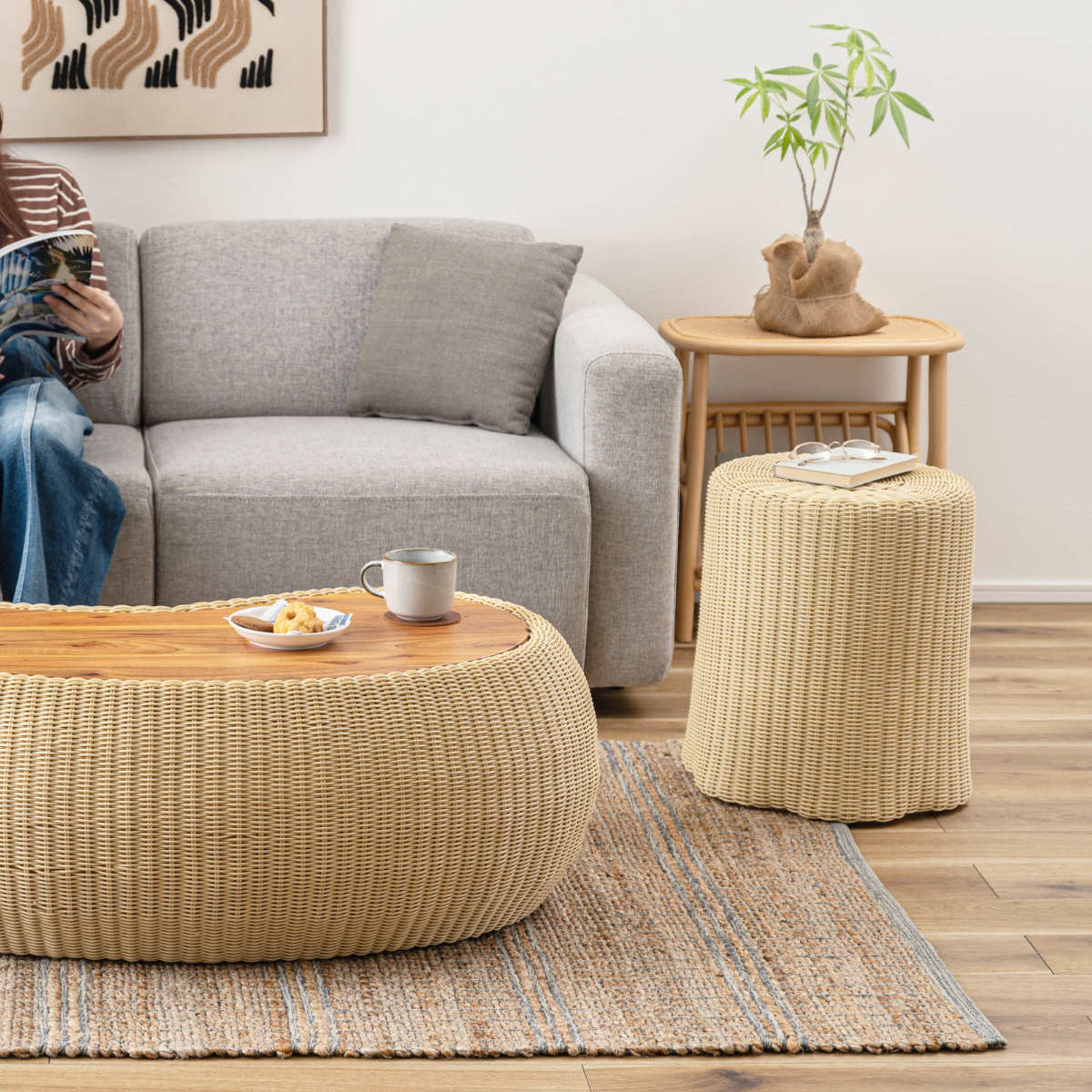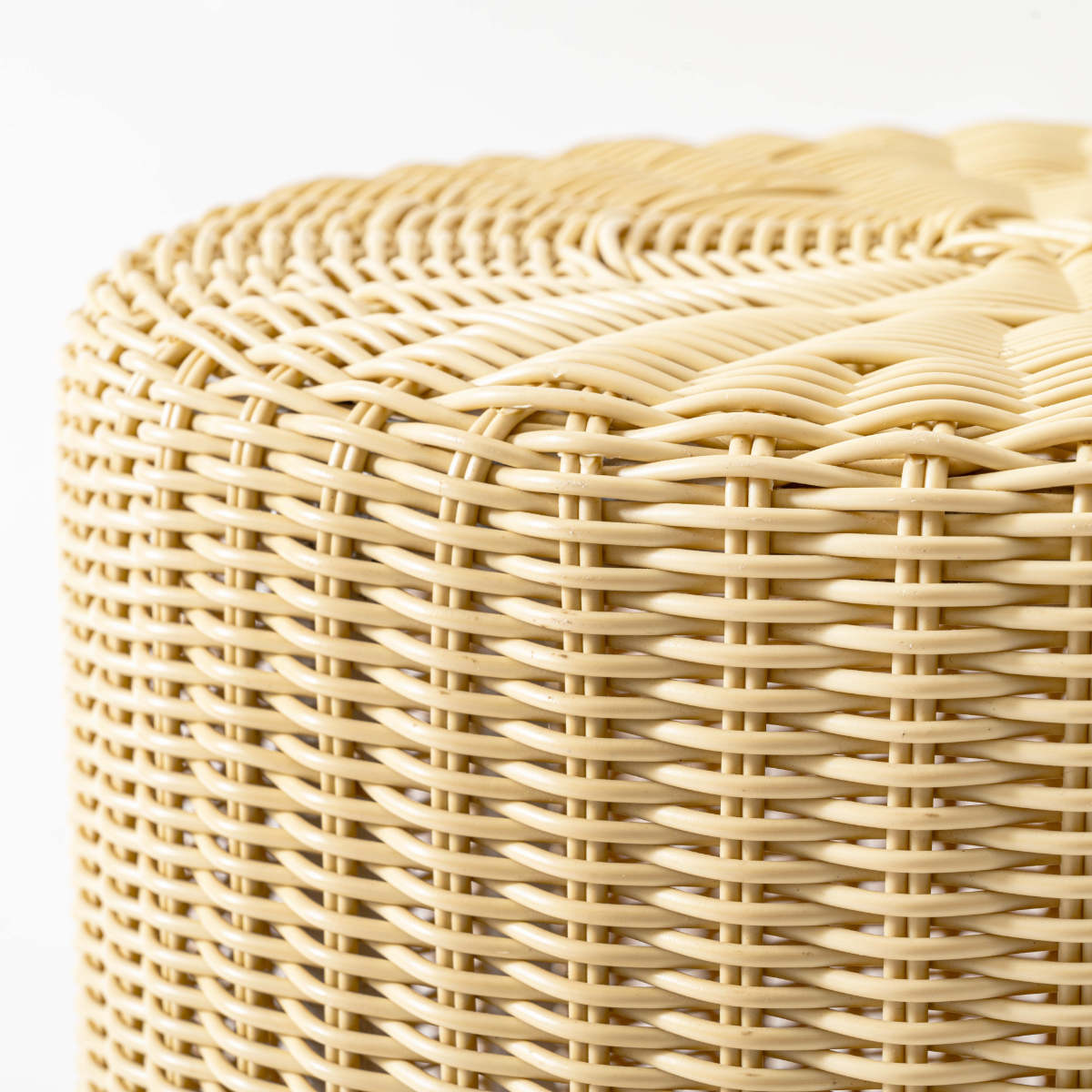 ナチュラルな色味の人工ラタン(PPラタン)を丁寧に編み込み、曲線を活かした、上品で個性的なスツールです。下方向にほのかに広がる形状で、まるで切り株に座って休憩しているよう。安定感があり、ホッと癒されます。また、高めの設計なので、立ち座りの動作がラクにできます。