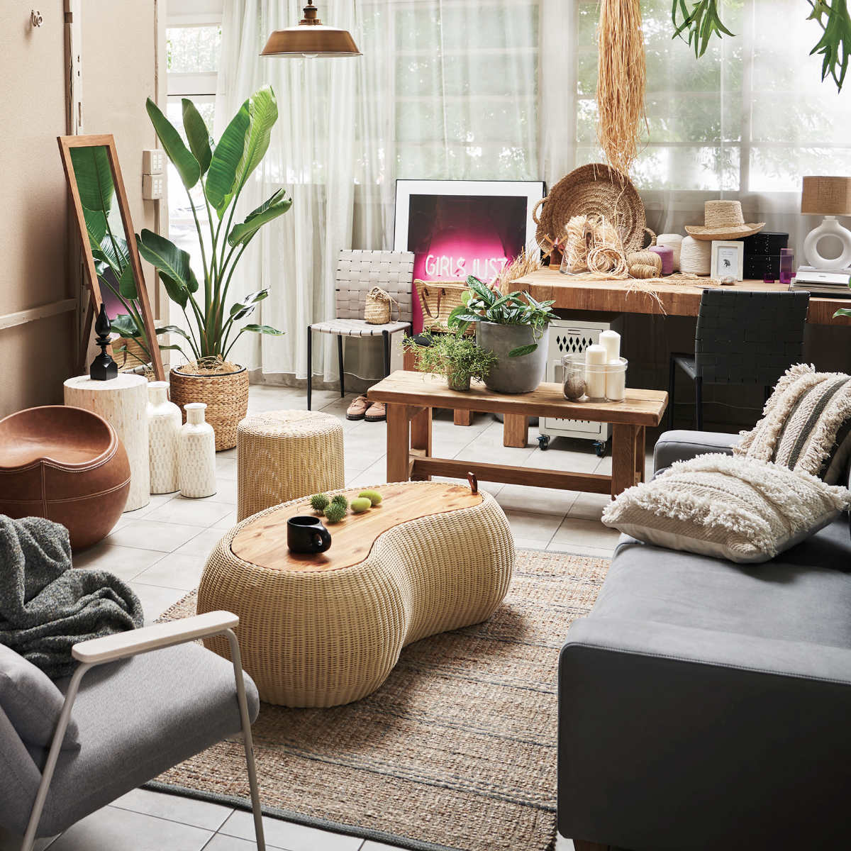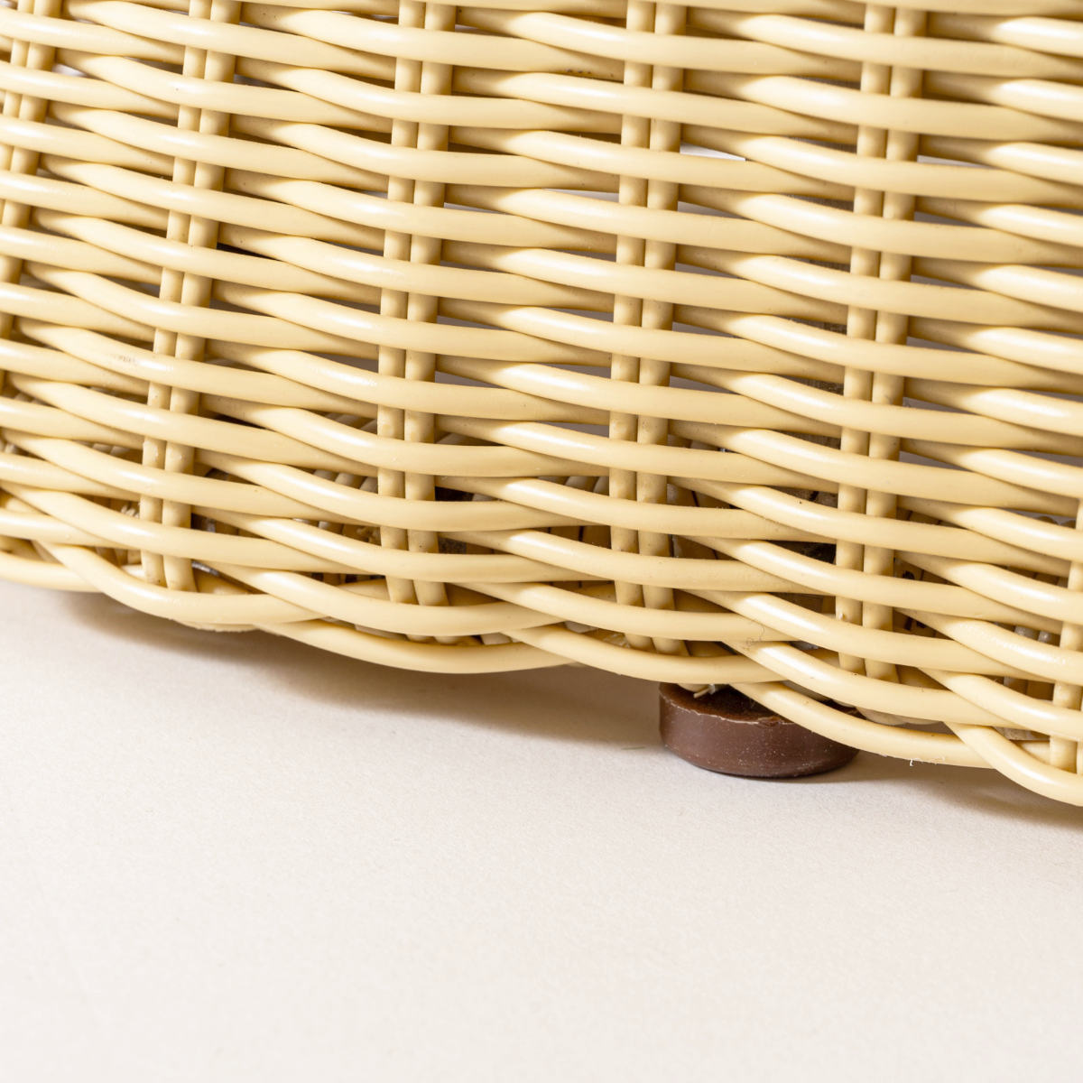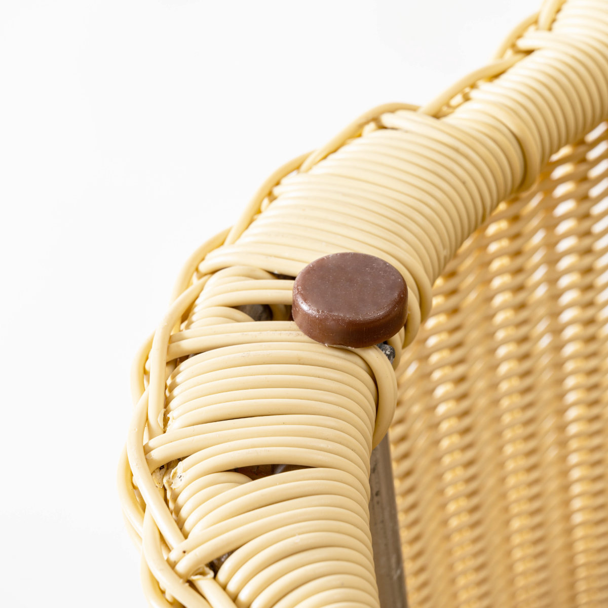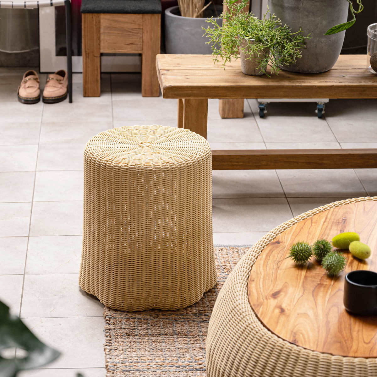 ナチュラルな色味の人工ラタン(PPラタン)を丁寧に編み込み、曲線を活かした、上品で個性的なスツールです。下方向にほのかに広がる形状で、まるで切り株に座って休憩しているよう。安定感があり、ホッと癒されます。また、高めの設計なので、立ち座りの動作がラクにできます。