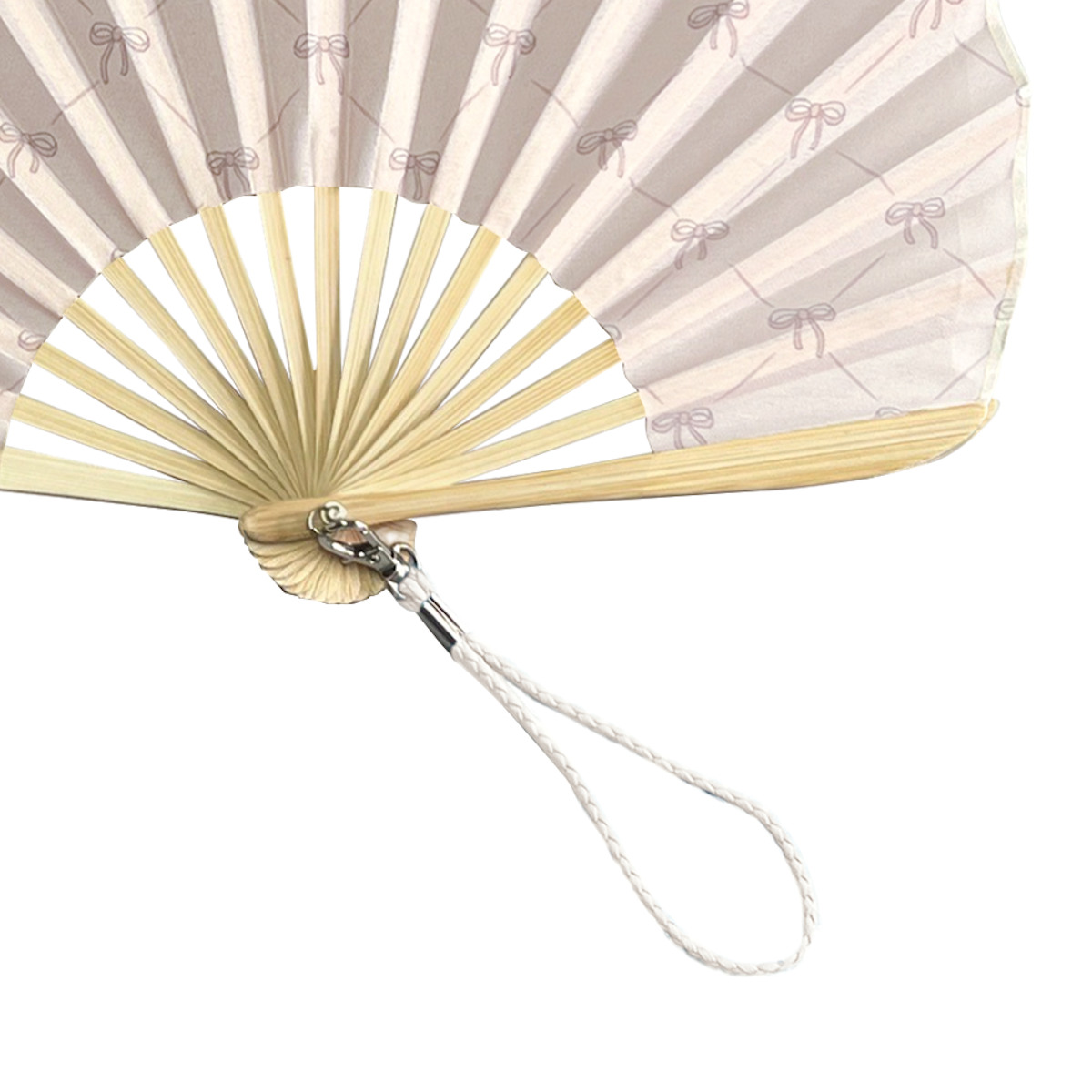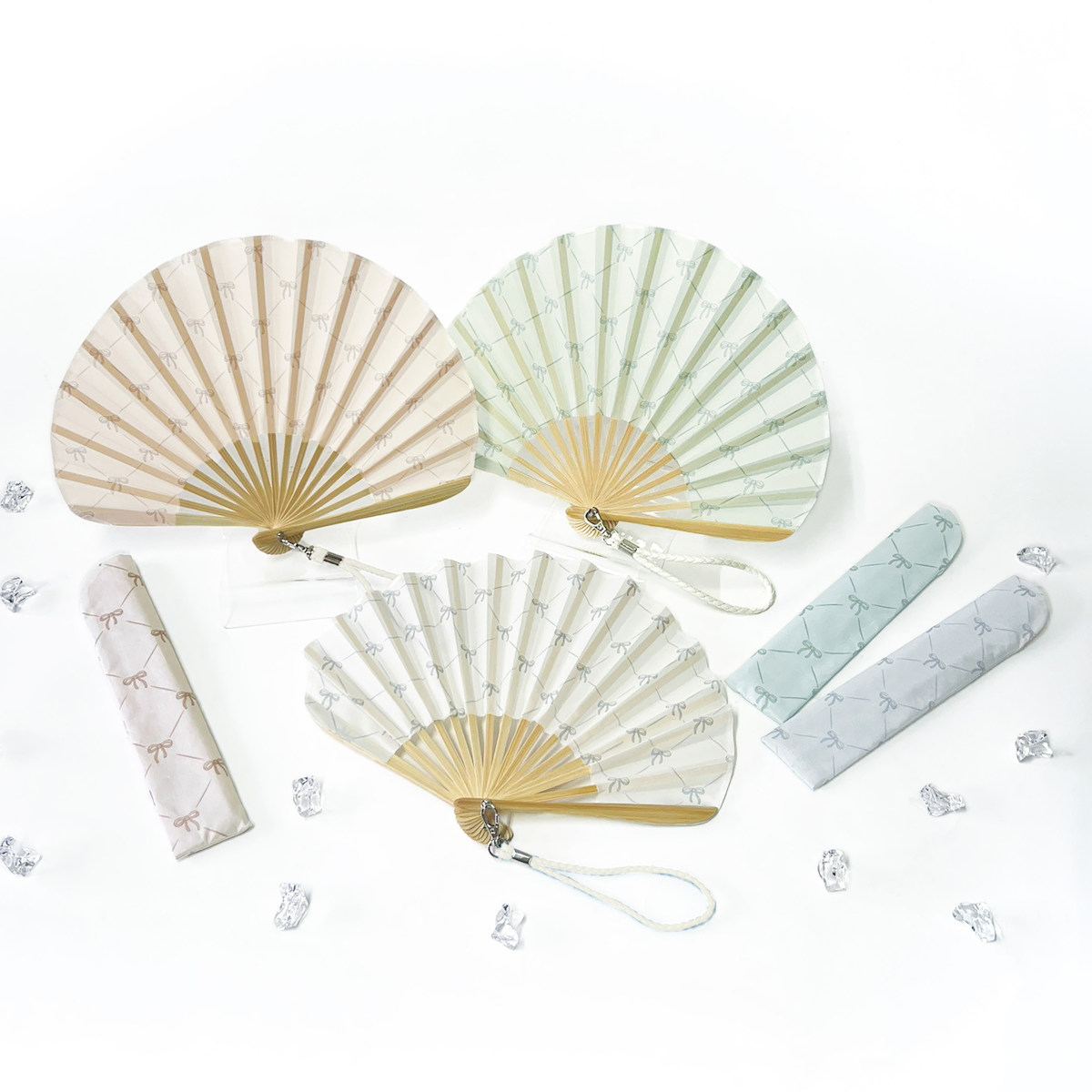 扇子の扇面(地紙)とケースには、お揃いのデザインが施されています。リボン柄が散りばめられており、とってもキュートですが、程良い光沢が上品な華やかさを感じさせる扇子&ケースのセットです。