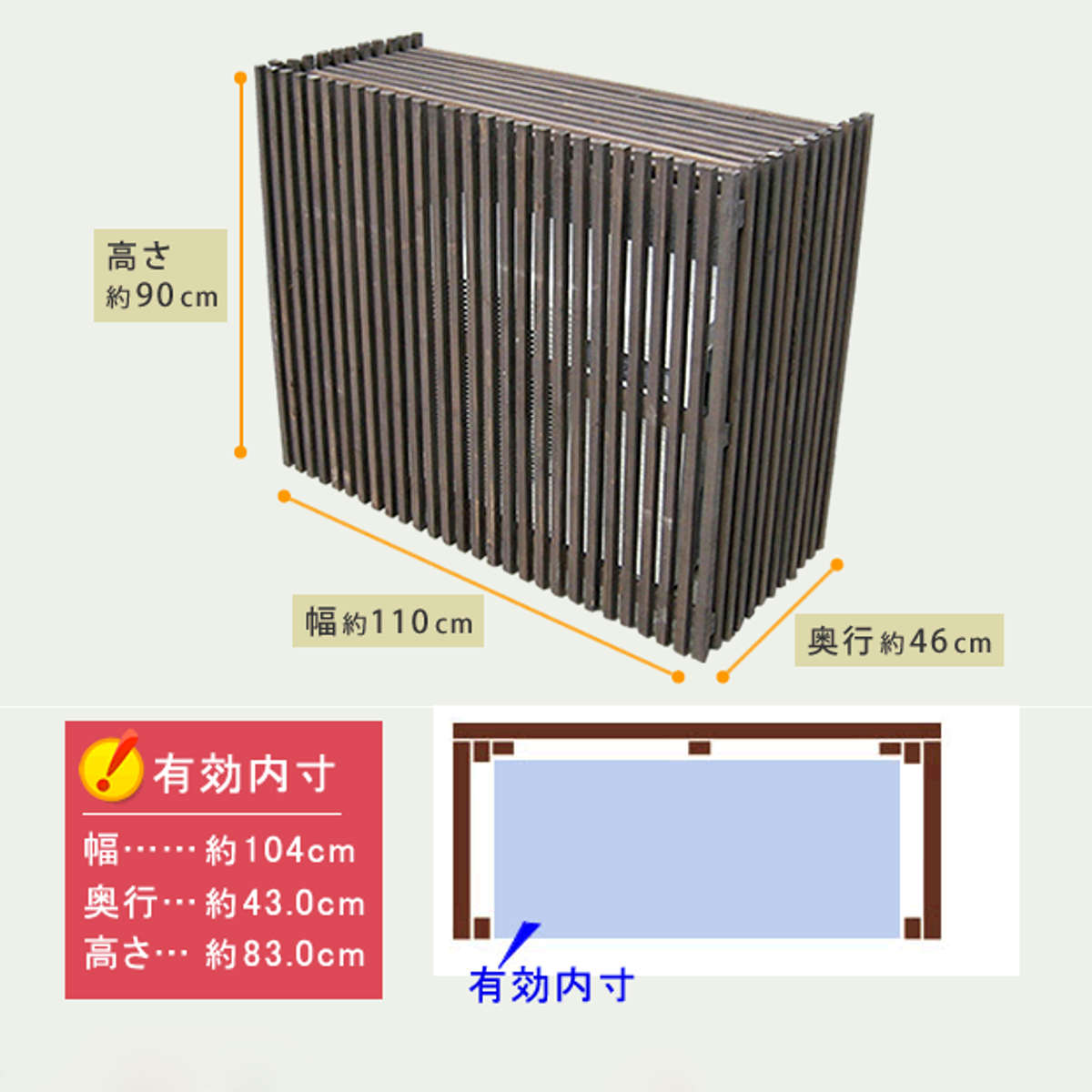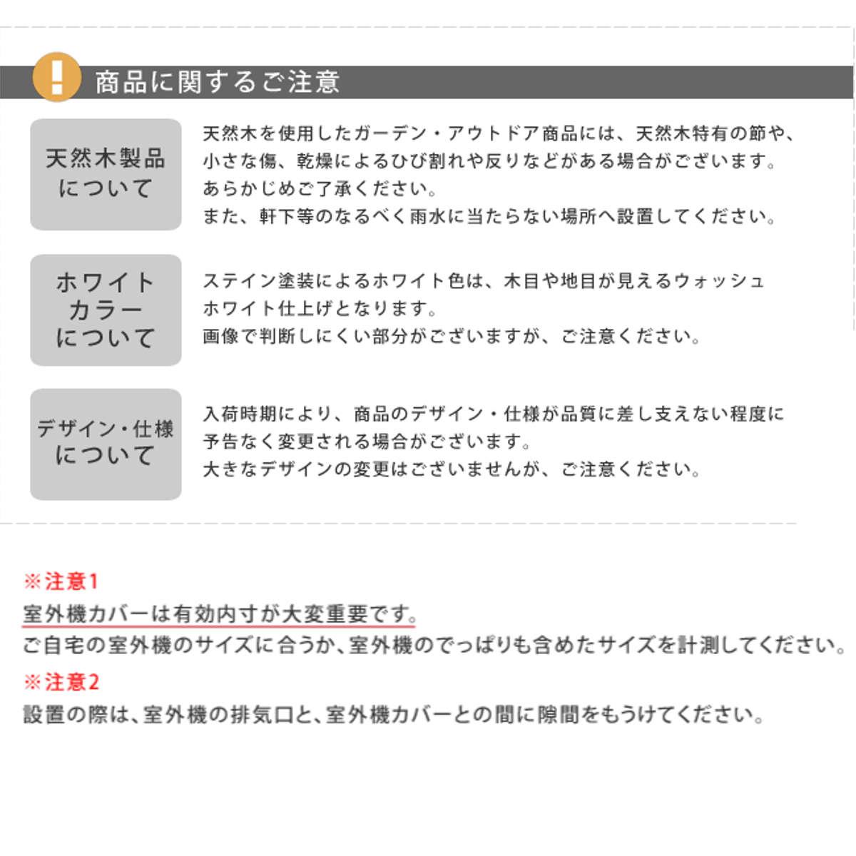 | 注意事項 | ※有効内寸をご確認いただき、室外機のでっぱりも含めたサイズを計測してください ※設置の際は、室外機の排気口と、室外機カバーとの間に隙間をもうけてください |