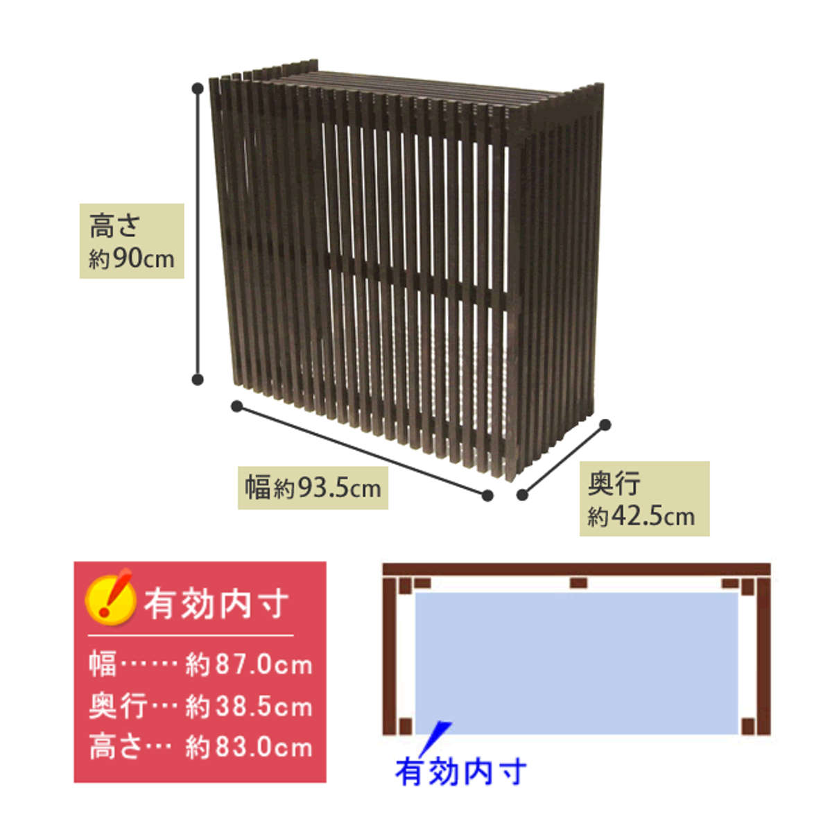 | 注意事項 | ※有効内寸をご確認いただき、室外機のでっぱりも含めたサイズを計測してください ※設置の際は、室外機の排気口と、室外機カバーとの間に隙間をもうけてください |