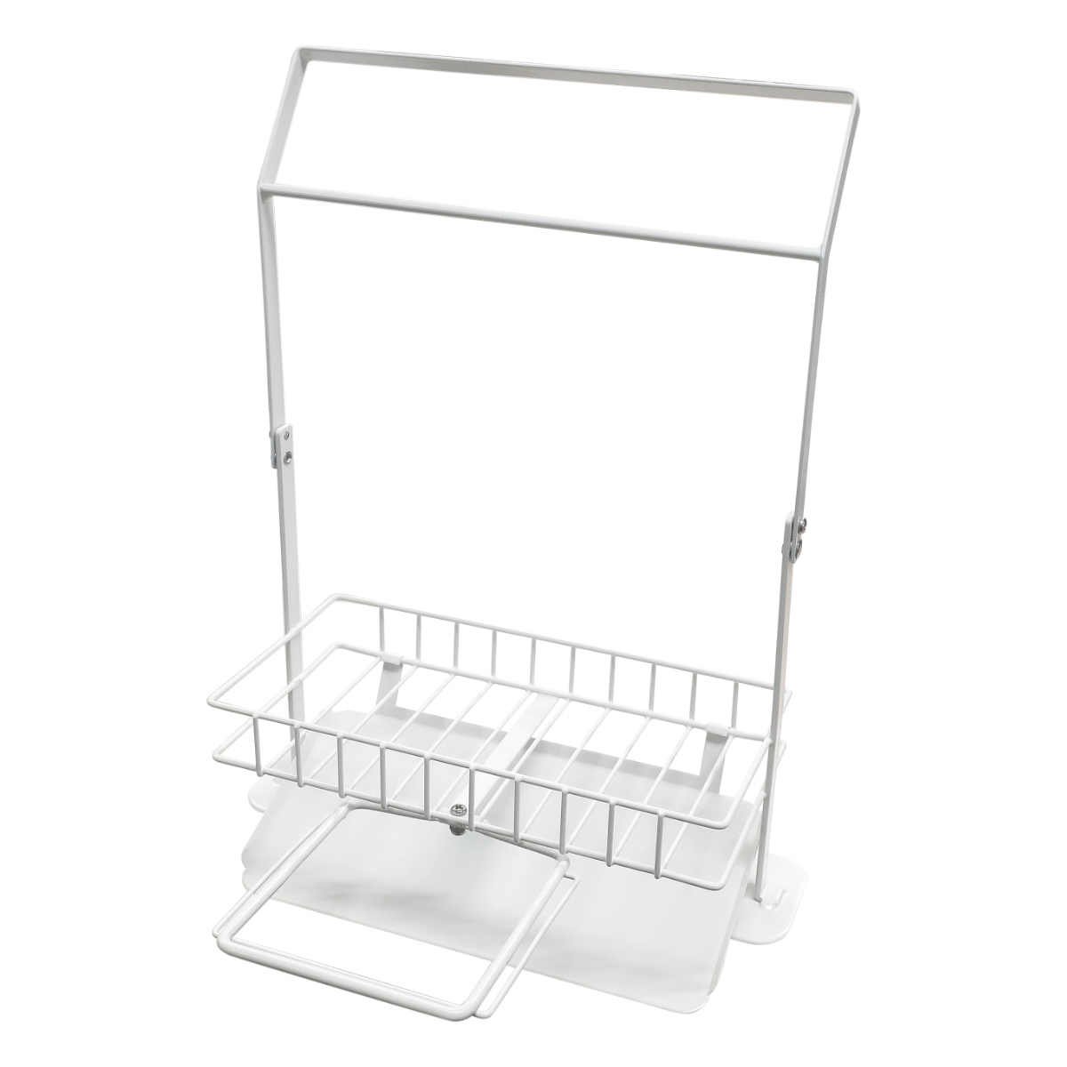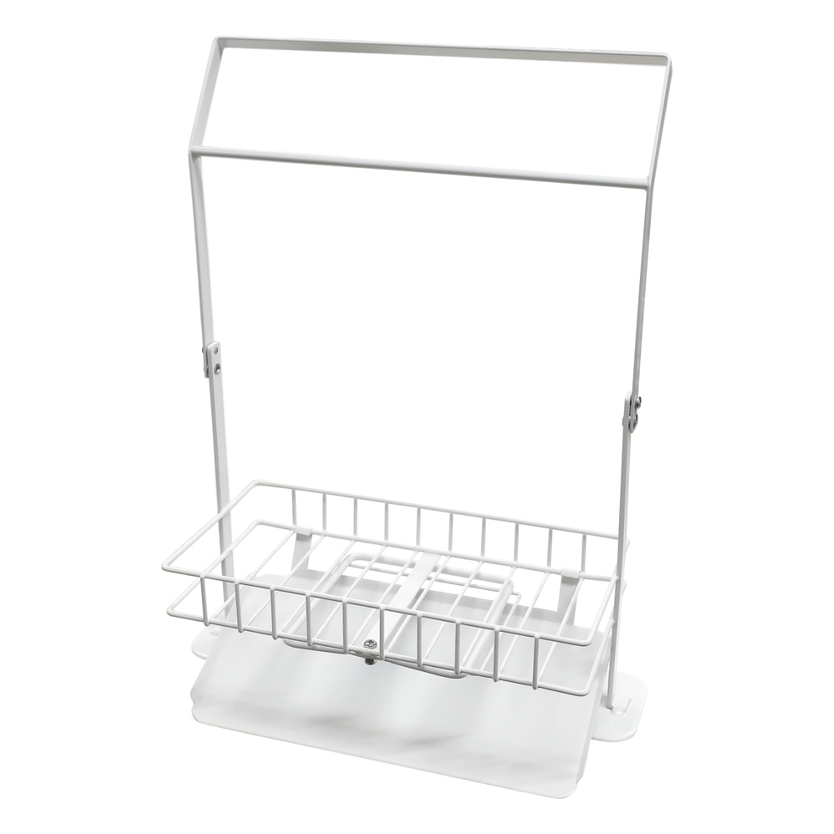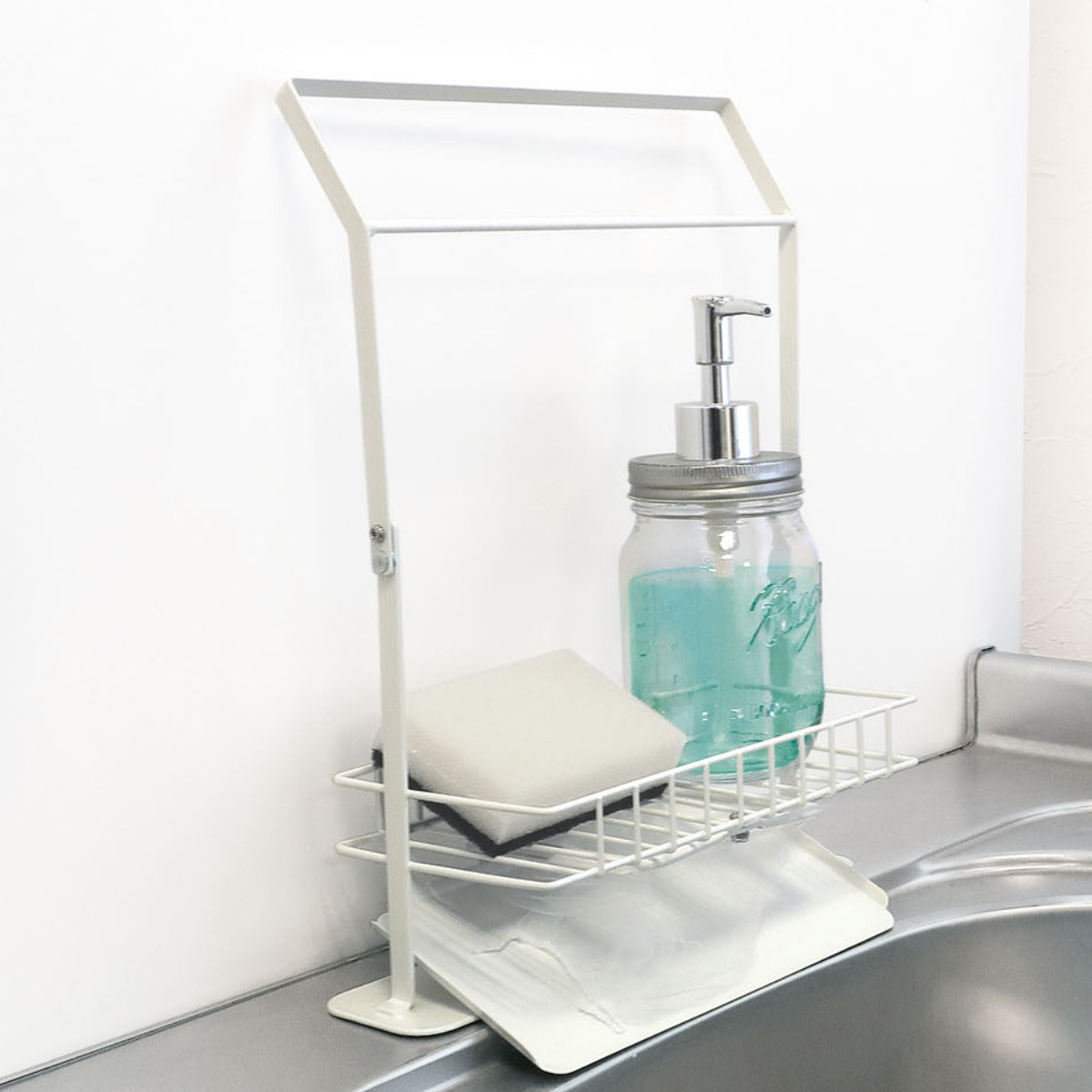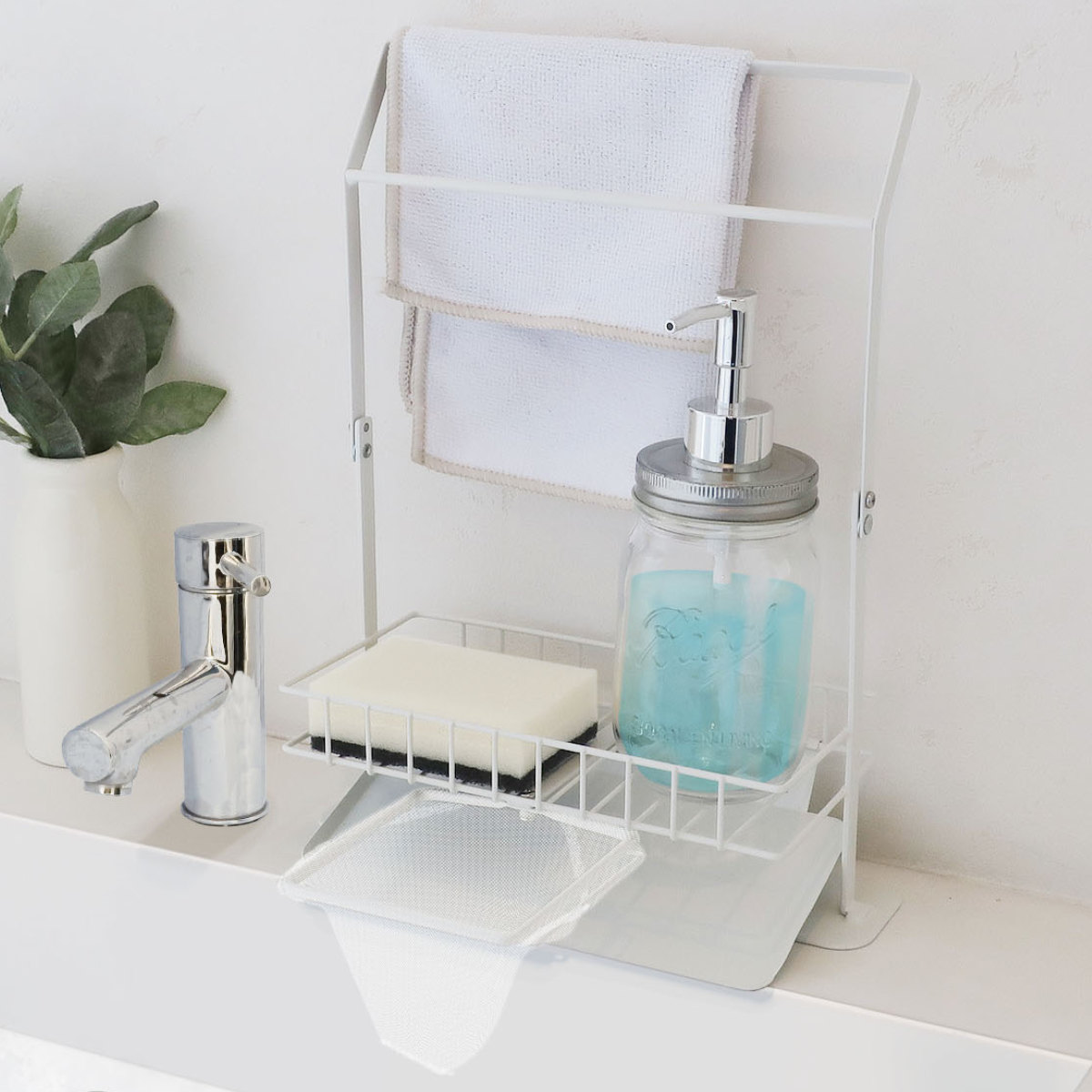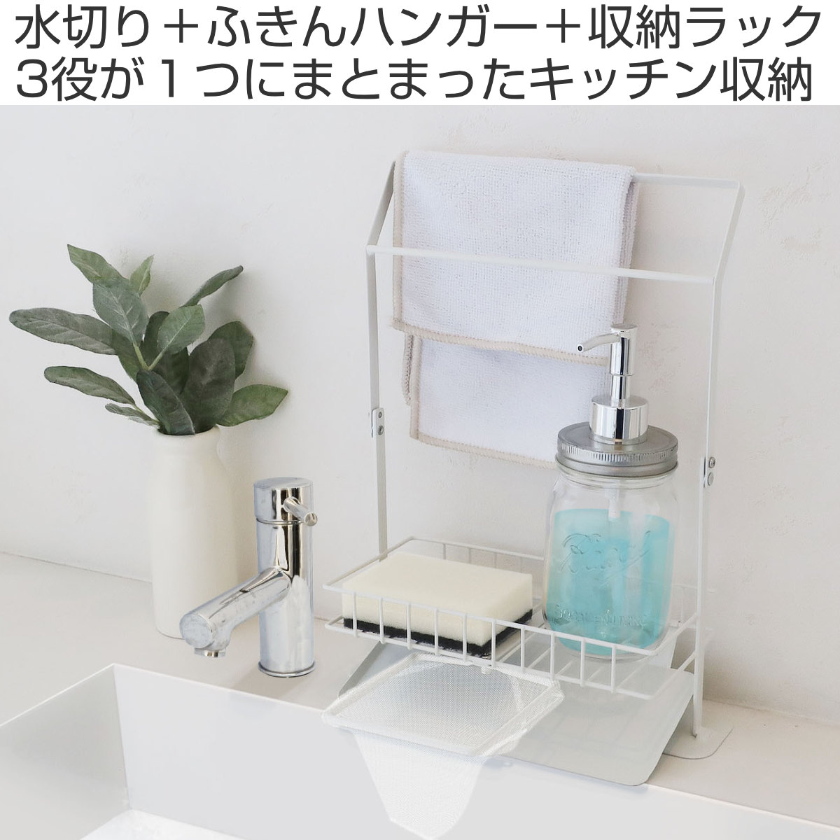 「水切りホルダー」「ふきんハンガー」「収納ラック」が1つになった優れもの。スポンジやボトルの収納だけでなく、ふきん掛け、生ゴミの水切りまでマルチに活躍してくれます。シンク周りに設置するだけで収納力がアップします。