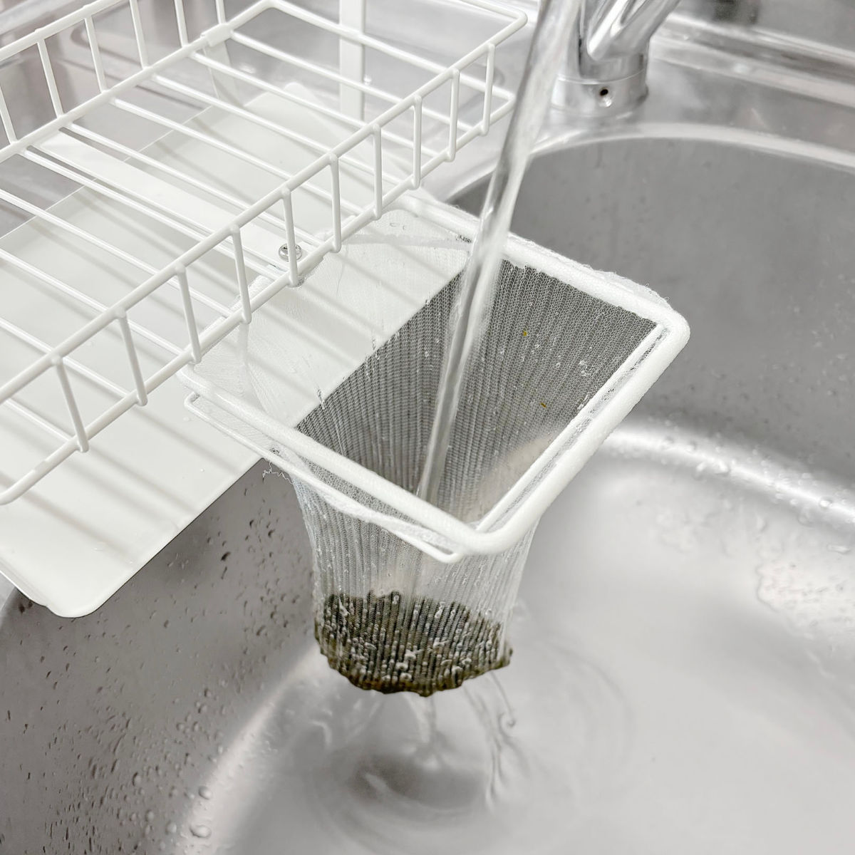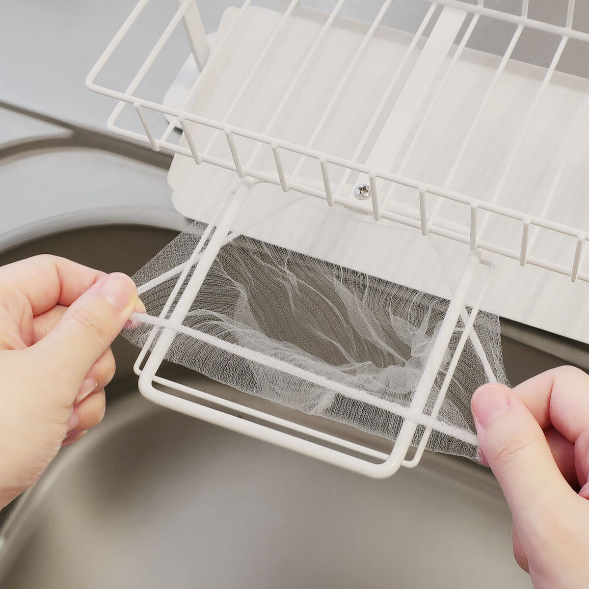 水切りホルダーにストッキングタイプの浅型用水切りネットを装着することができます。シンク内に食べ残し等のちょっとした生ゴミ捨てができて便利です。
