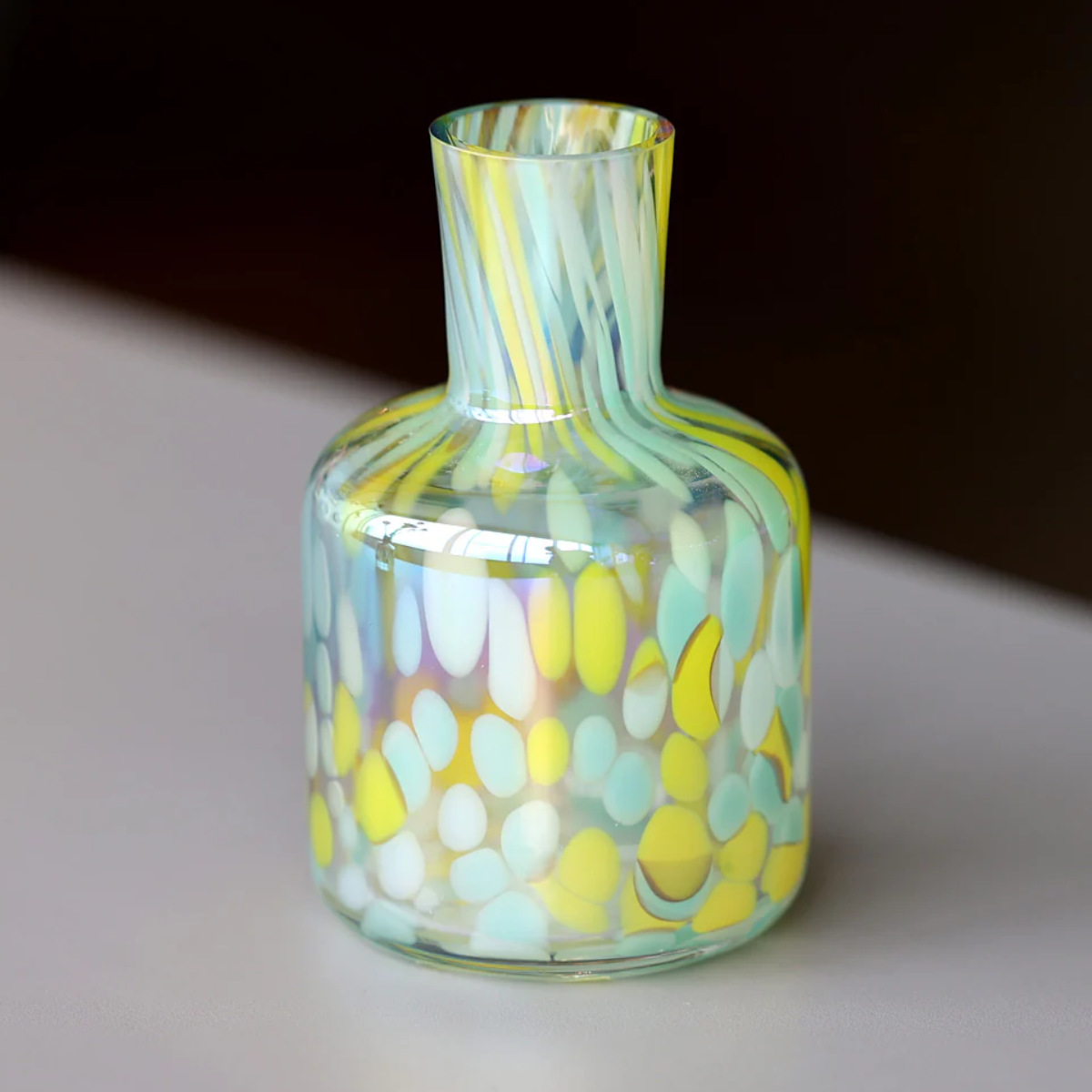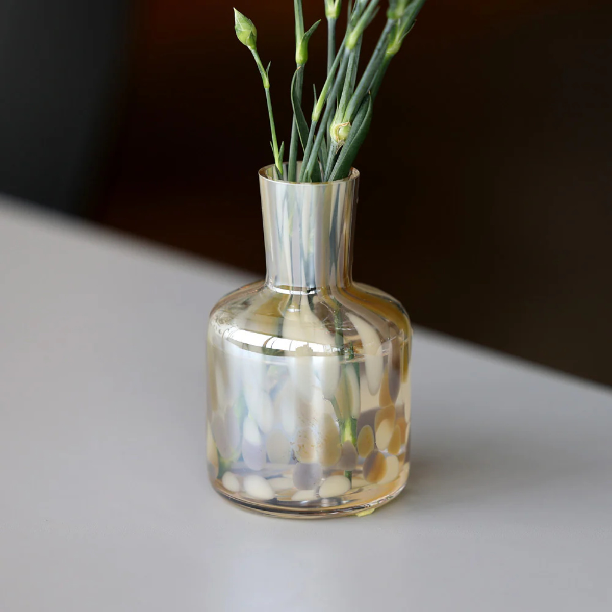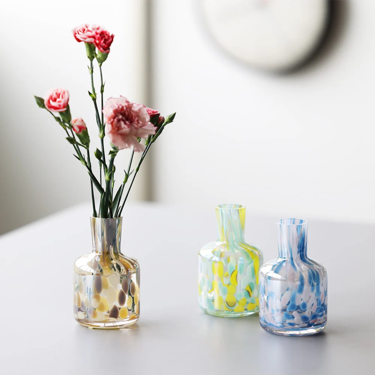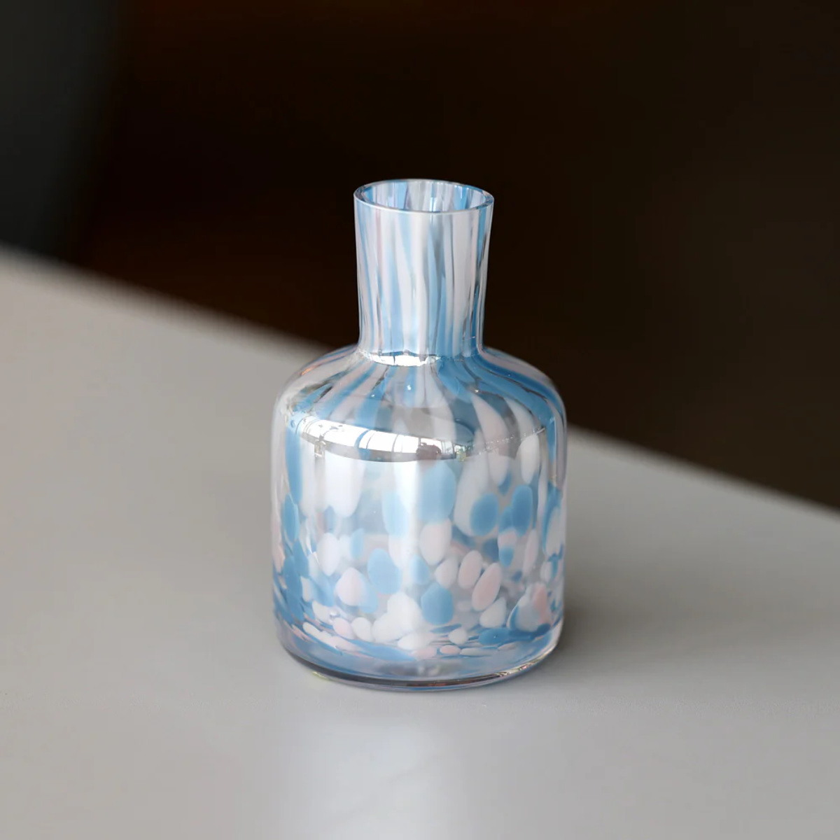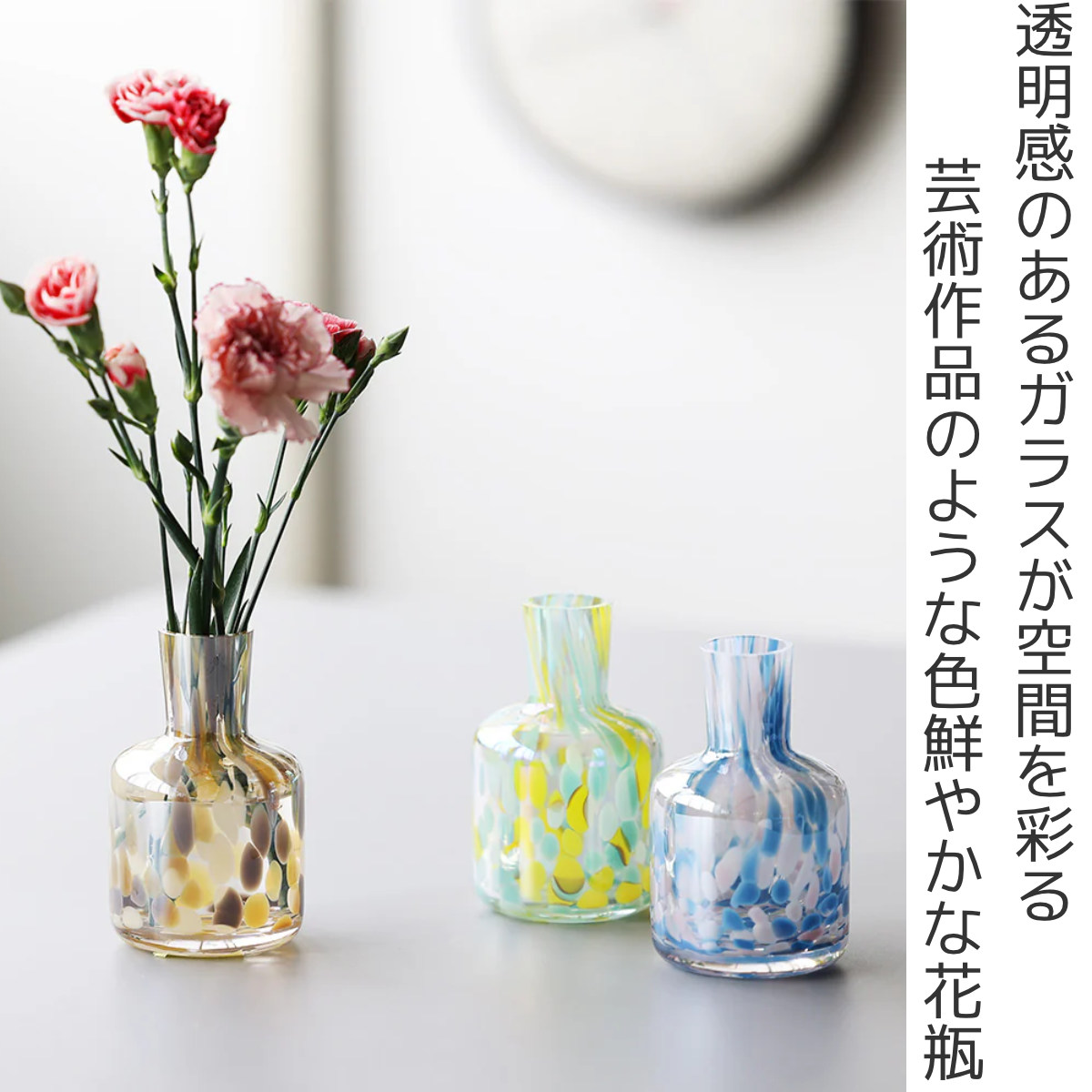 花をより美しく引き立てるガラス製の花瓶です。ひとつひとつ丁寧に作られたマーブル模様は、まさに芸術作品のような美しさです。繊細で透明感のあるガラスがお部屋を涼やかに彩ります。
