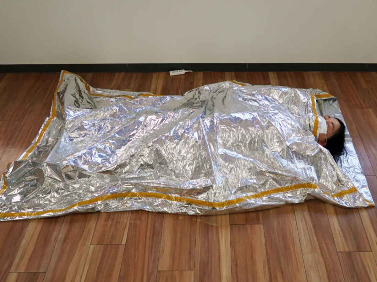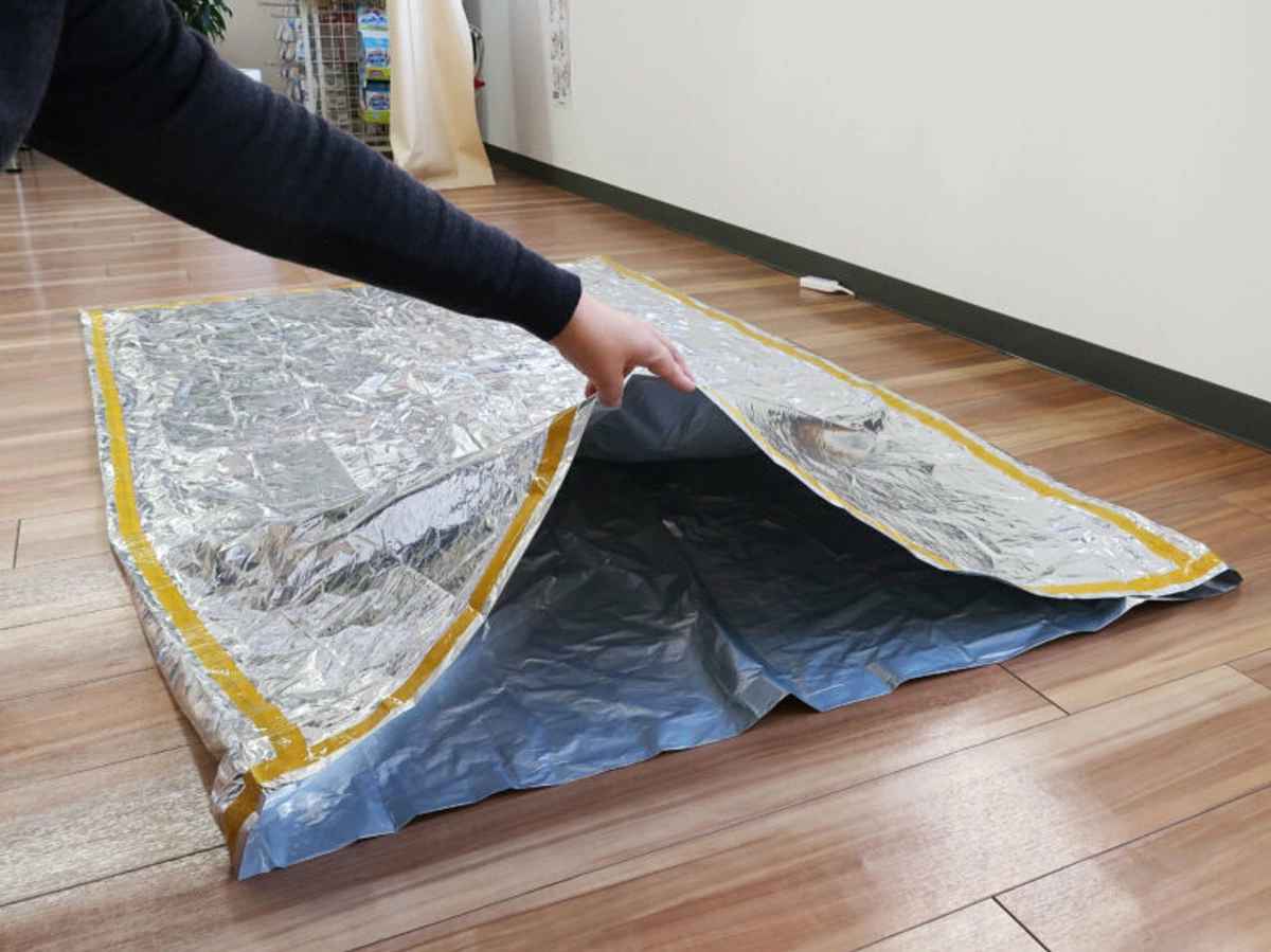 災害・避難時の防寒用として使えるアルミ寝袋です。アルミの保温効果で温かく、毛布などと併用すると保温力がアップします。アルミニウム特有のシャカシャカ音を少なくした静音タイプなので、避難時や就寝時に周囲への音を気にせず休めます。