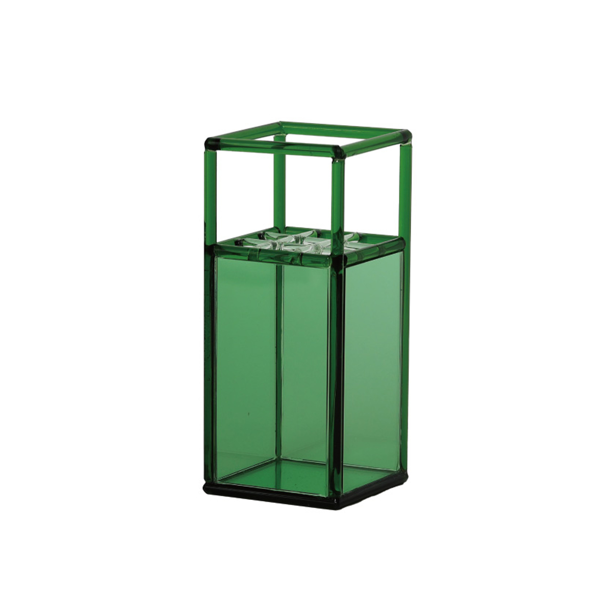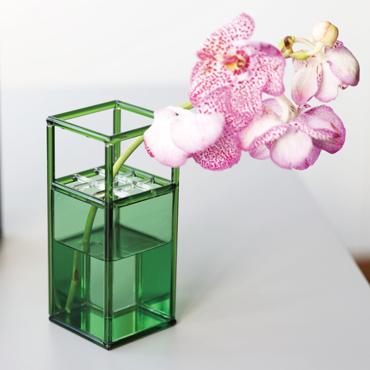 下部は水を入れるスペース、上部は花を支えるフレームとして機能。さらに、中央部にある格子状のフレームが背の高い花や茎が細い花をしっかりサポートし、安定感を生み出します。