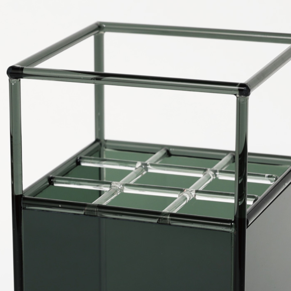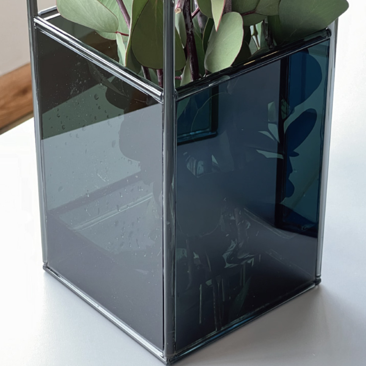 見る角度によって表情が変わり、奥行きも楽しめるガラスベースです。透明感のあるガラスは、花や葉の美しさを際立たせ、光を美しく透過します。