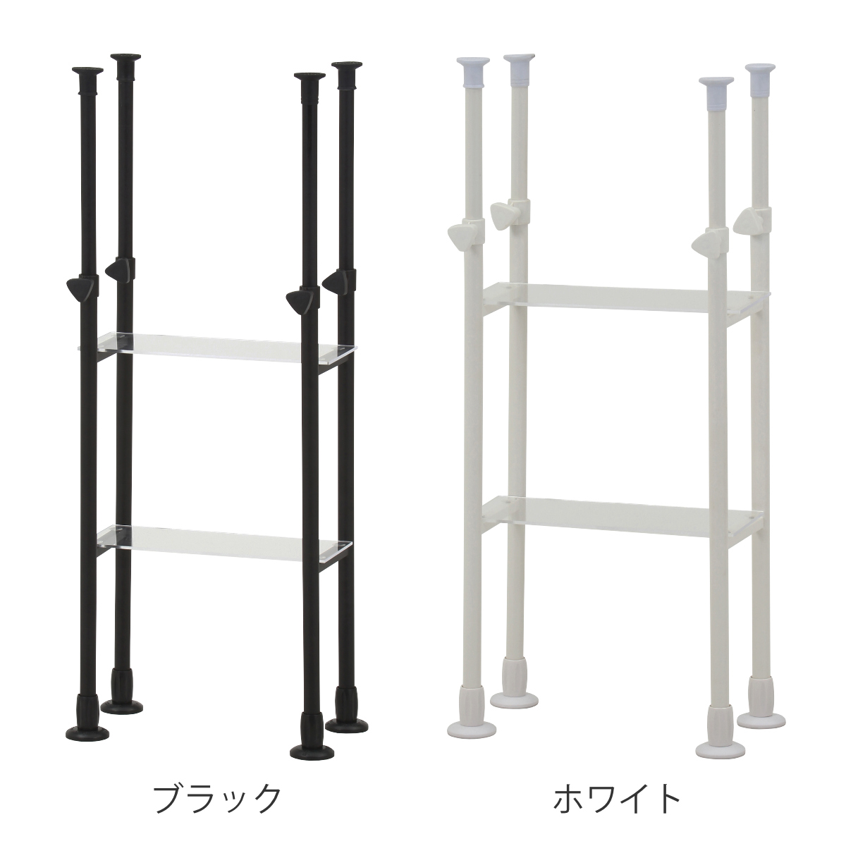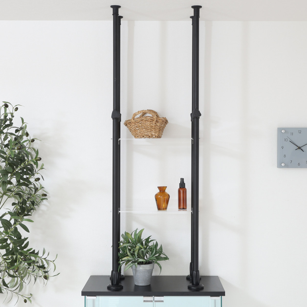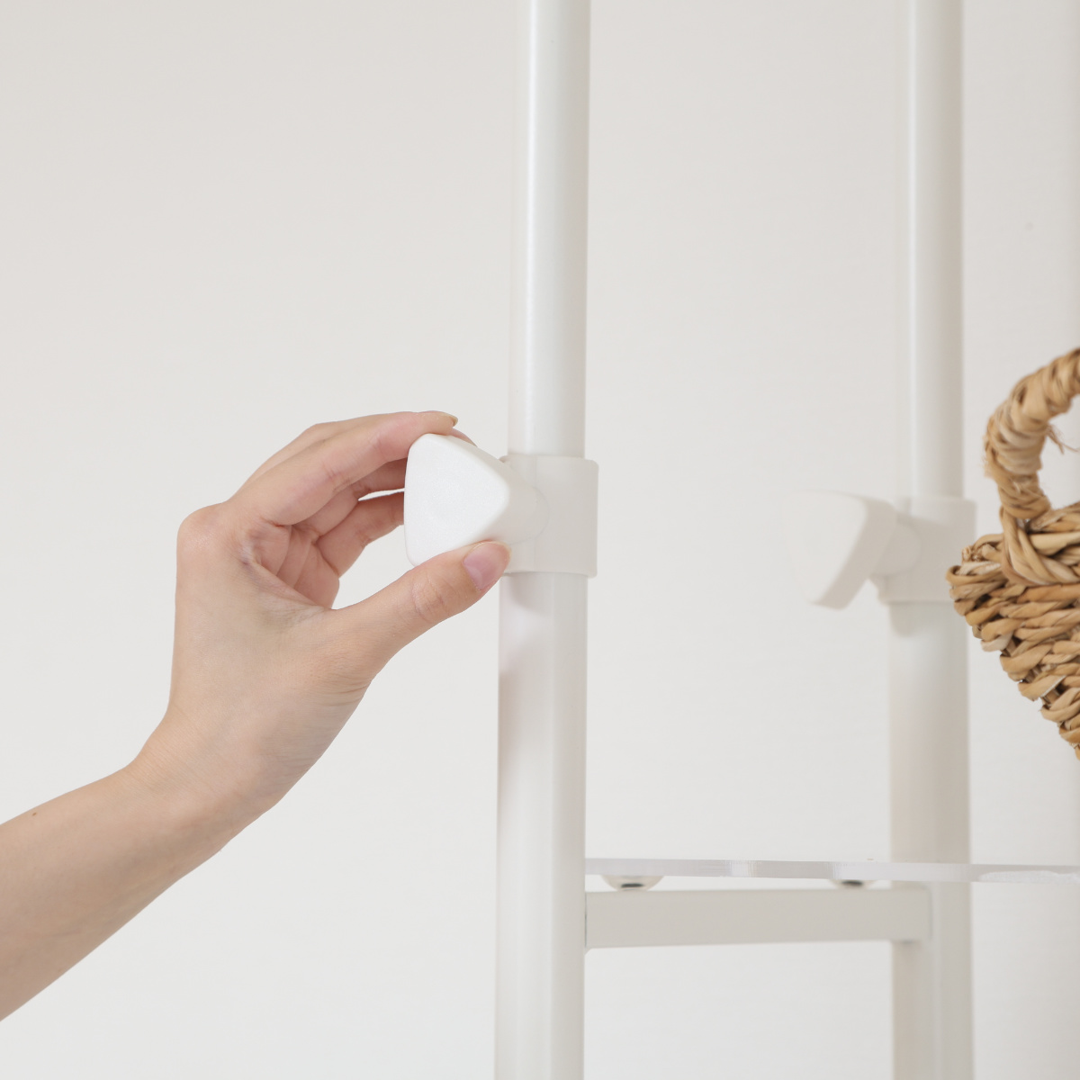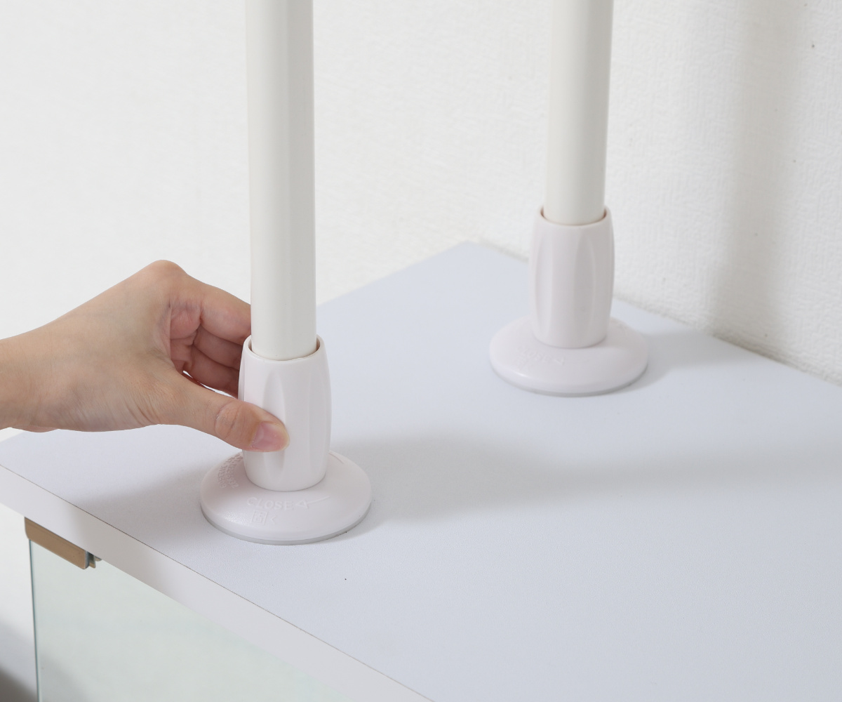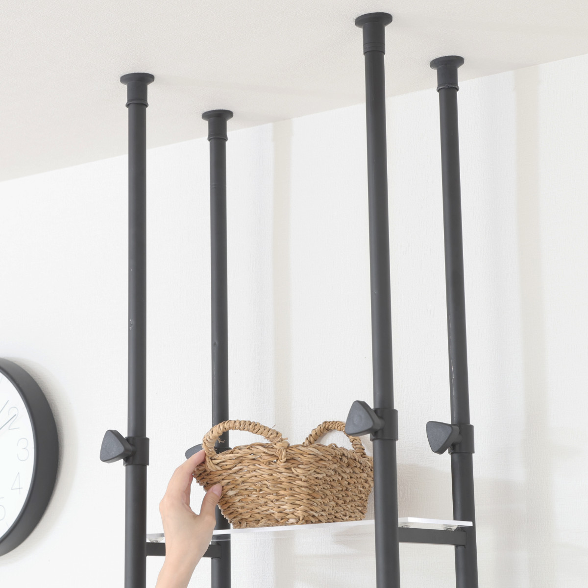 取り付けには、ネジなどの工具は必要なく、誰でも簡単に設置できます。高さも、使用する棚と天井の高さに合わせて調整できます。