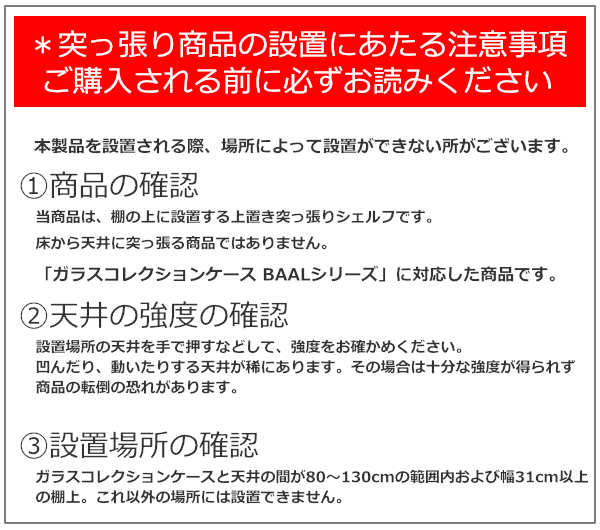 | 備考 | 設置可能範囲:ガラスコレクションケースと天井の間が80~130cmおよび幅31cm以上の棚上 |