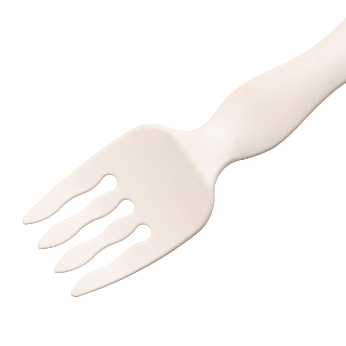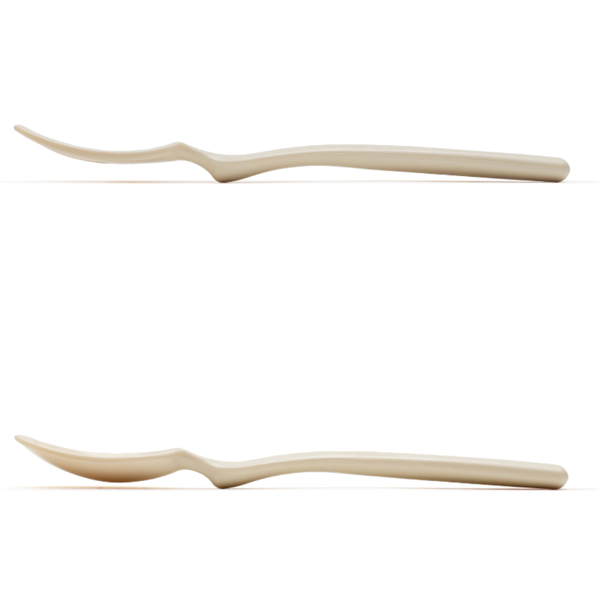 スプーンとフォークは、テーブルに置いても口に入れる部分が触れない形状です。衛生的で清潔にお使いいただけます。