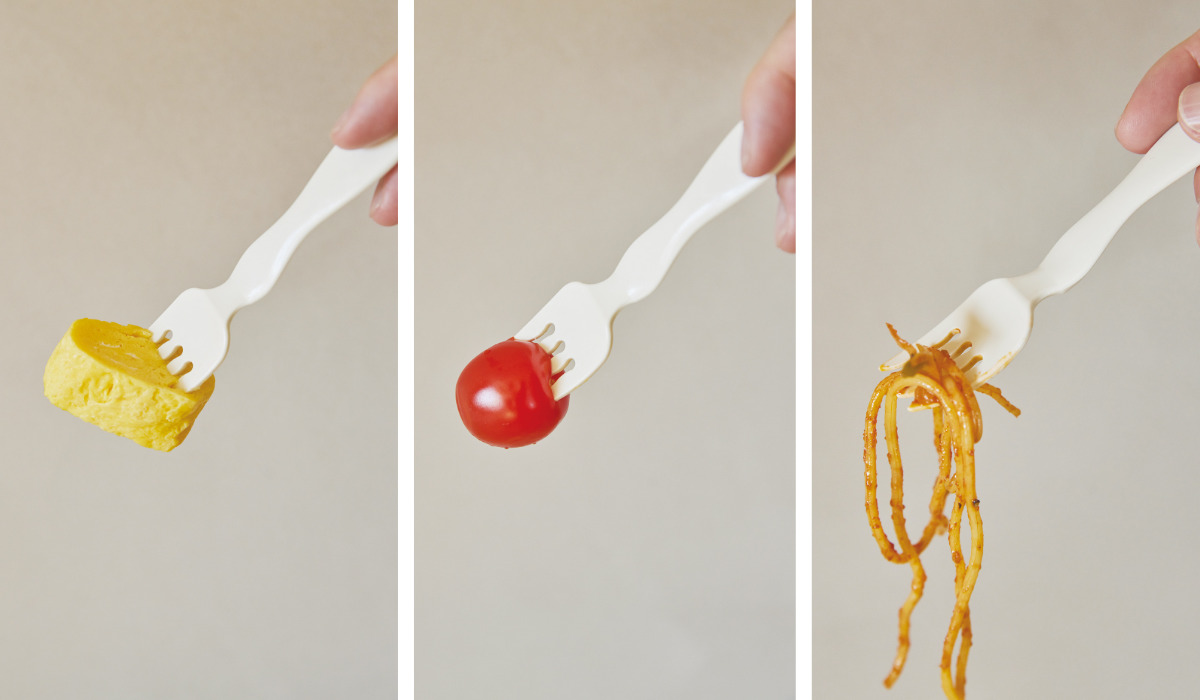 幅広の先端と浅めの枝が特長のフォークは小さな手でも扱いやすく、食材をしっかりキャッチできるよう工夫されています。卵焼きは崩れにくく、トマトも刺しやすいです。パスタもスリットに絡めてすくいやすいのでさまざまな食材を楽しく食べられます。