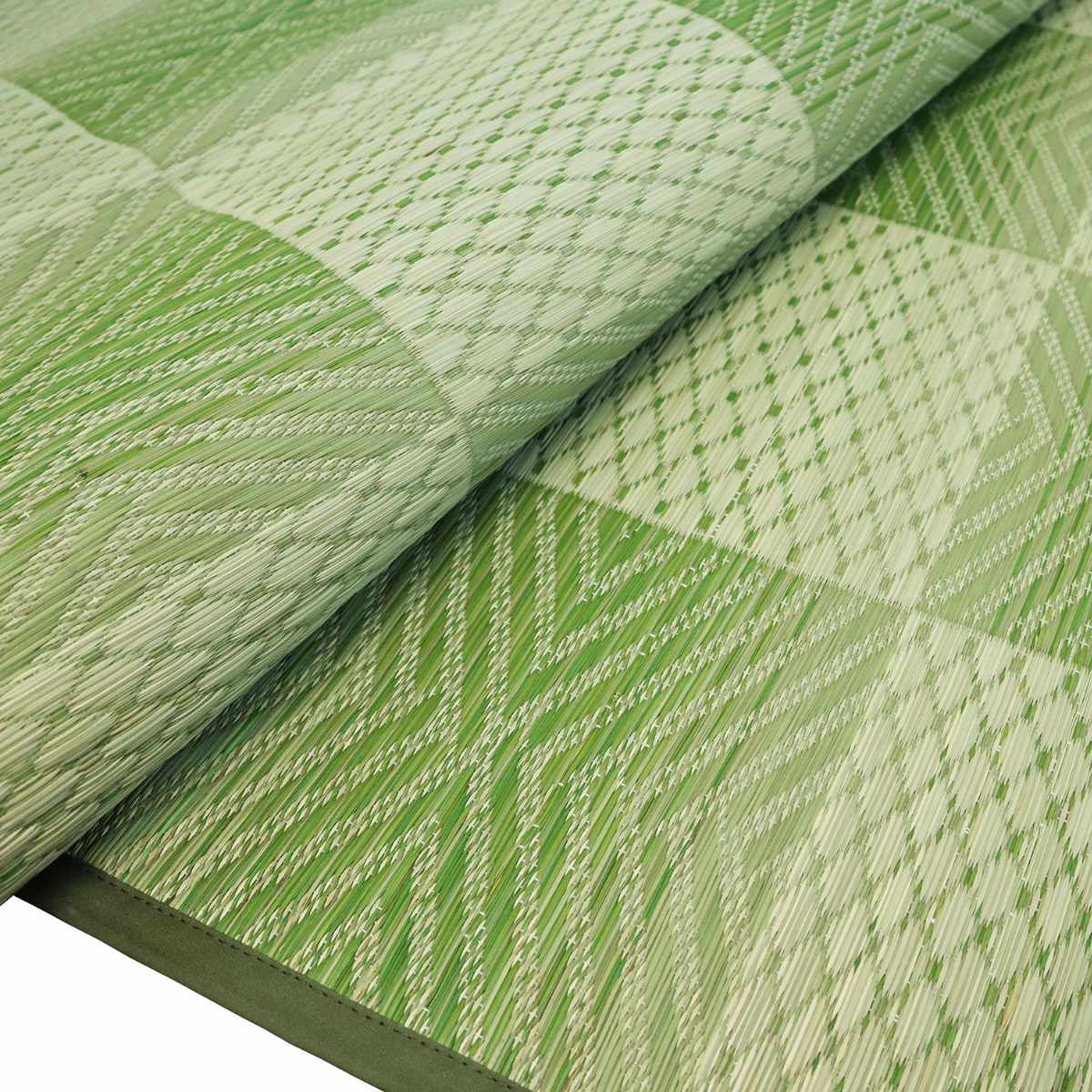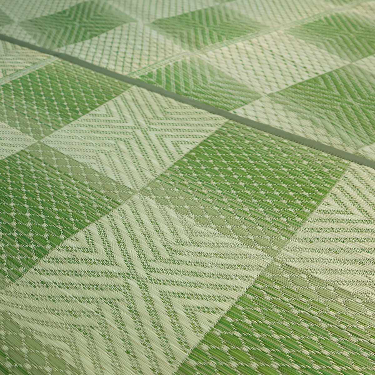 い草を織り込む経糸の間口を変えて紋様を織り出したもので、約209本の経糸が複雑な紋様をつくり出します。最も技巧的で折柄の変化に富む一品です。江戸間3畳用は4人掛けテーブルの下にラグとして使えるくらいの大きさです。畳の気になる箇所だけ敷いたり、フローリング上にラグの代わりに敷いたり、様々なシーンにお使いいただけます。