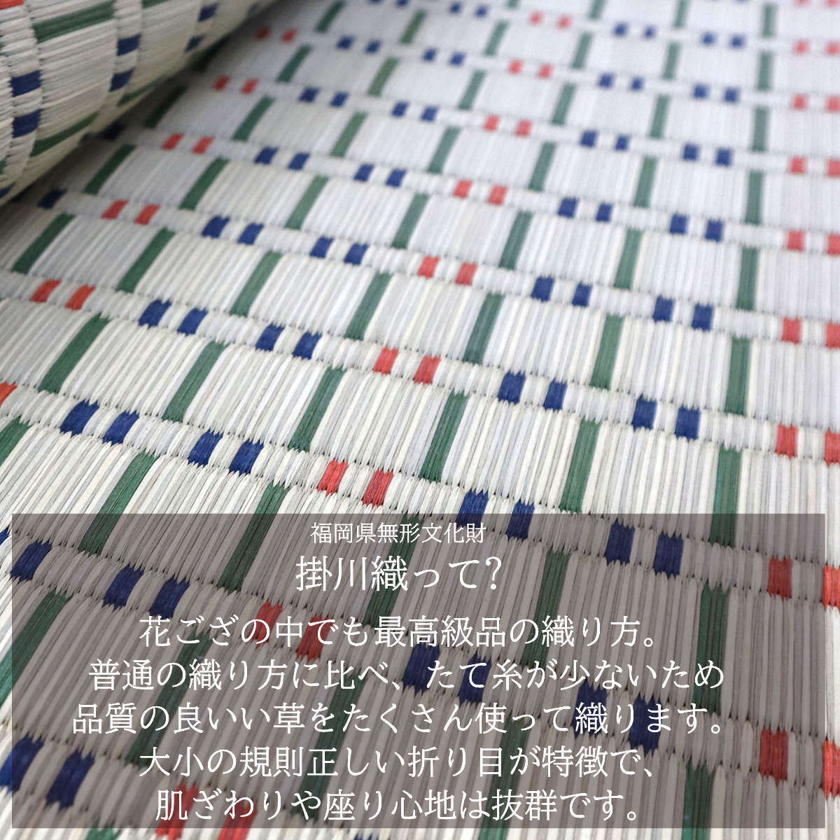 福岡県の無形文化遺産に登録された筑後地方伝統の織り方で織った美しい花ござです。江戸間2畳用はラグとして部分敷きにも使える大きさです。畳の気になる箇所だけ敷いたり、フローリング上にラグの代わりに敷いたり、様々なシーンにお使いいただけます。