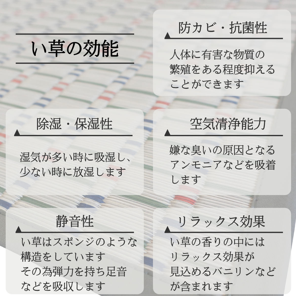 リビングや寝室などリラックスしたい場所に敷くことで、身体に優しいい草の効能が発揮され、快適な時間をお過ごしいただけます。
