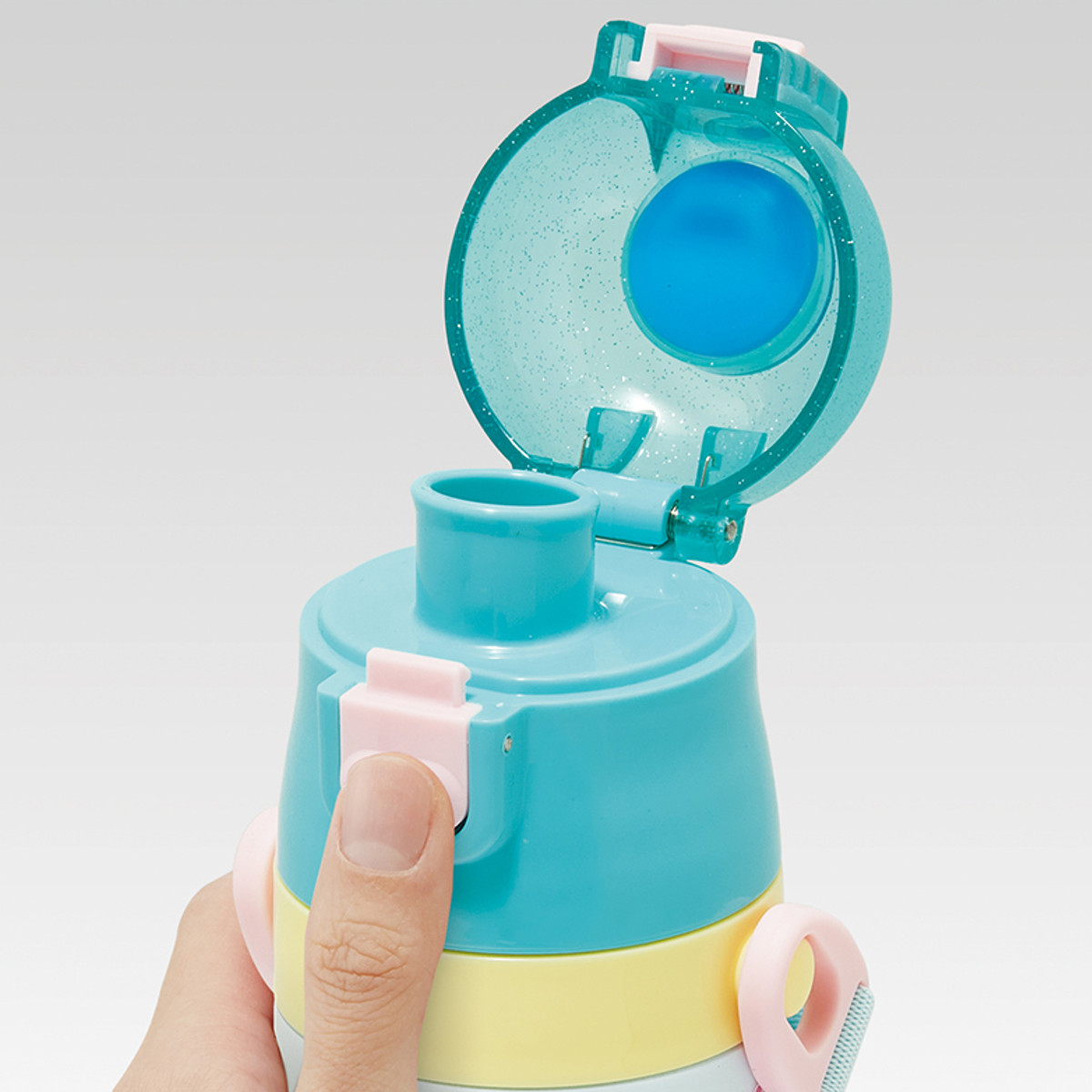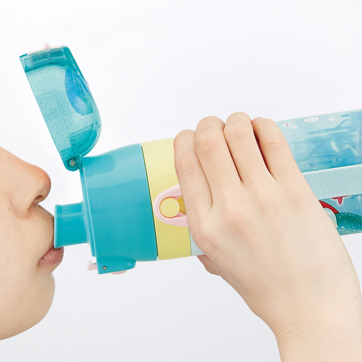 水筒の蓋はボタンを押すだけで開けることができるワンタッチ式です。飲み終わったら蓋をカチッと閉めるだけなので、小さなお子様でも簡単に開閉できます。