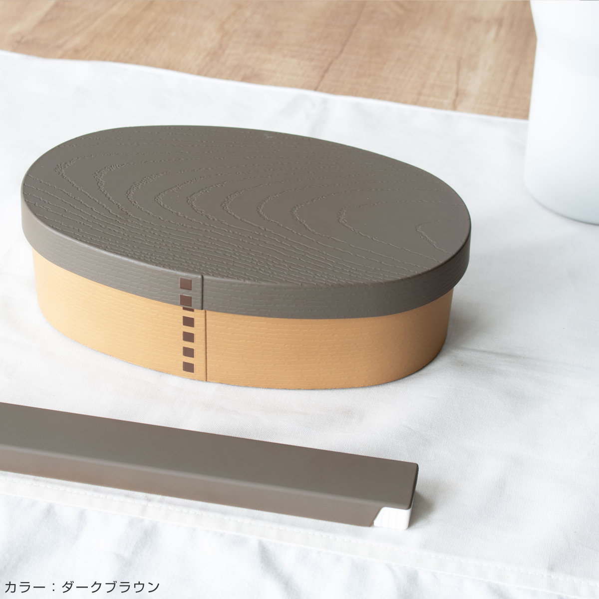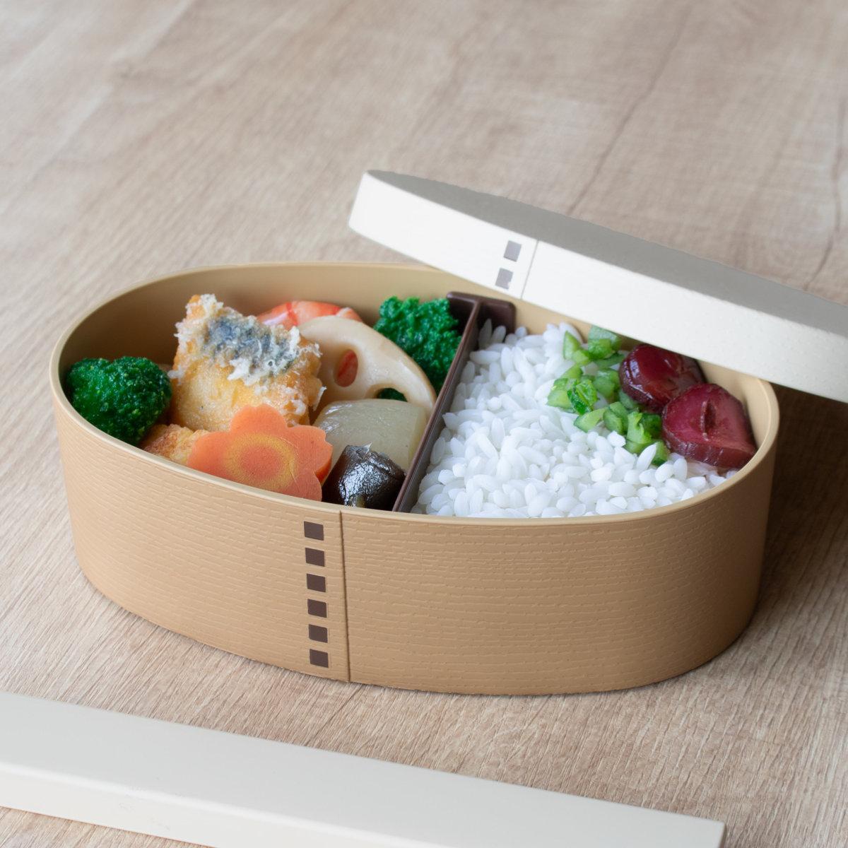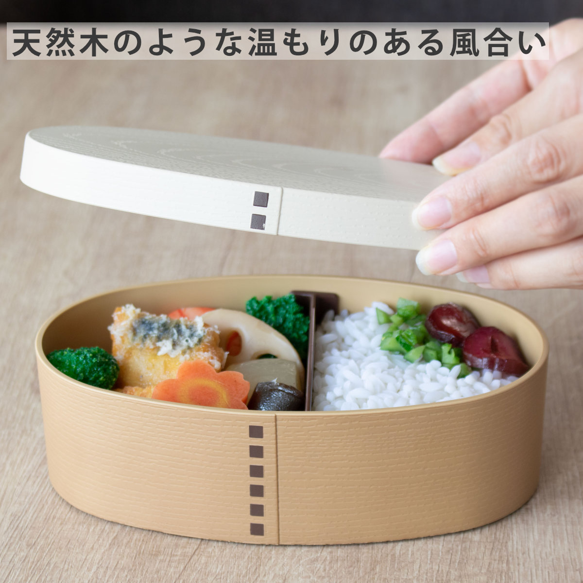樹脂製のお弁当箱でありながら、まるで本物の木のような仕上げが施されています。木製のお弁当箱に憧れているけどお手入れが大変そうという方にぴったりです。