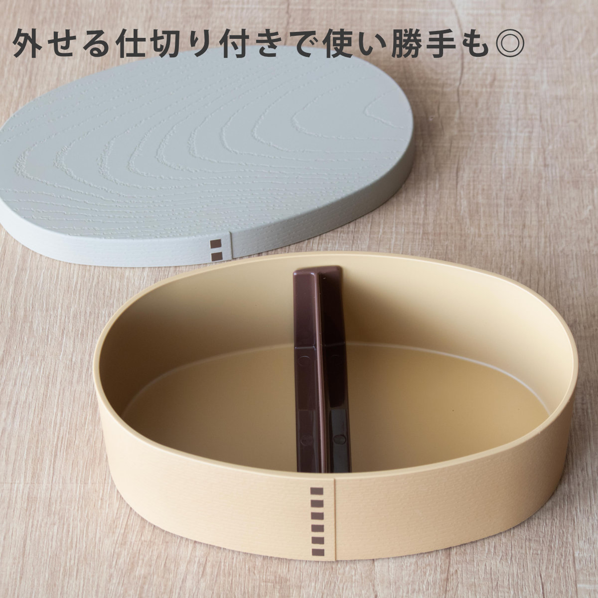 取り外しできる仕切り付きで、その日の気分でご飯とおかずの量を調整できます。どんぶり弁当やのっけ弁当など、仕切りを外した状態でお使いいただくこともできます。