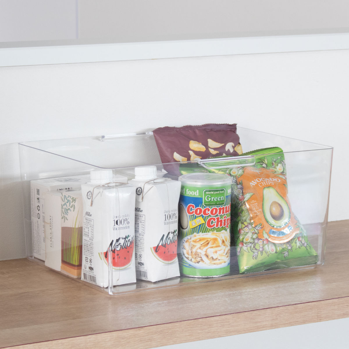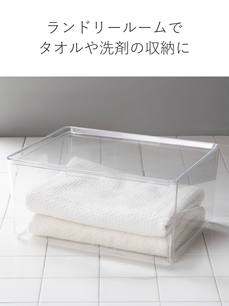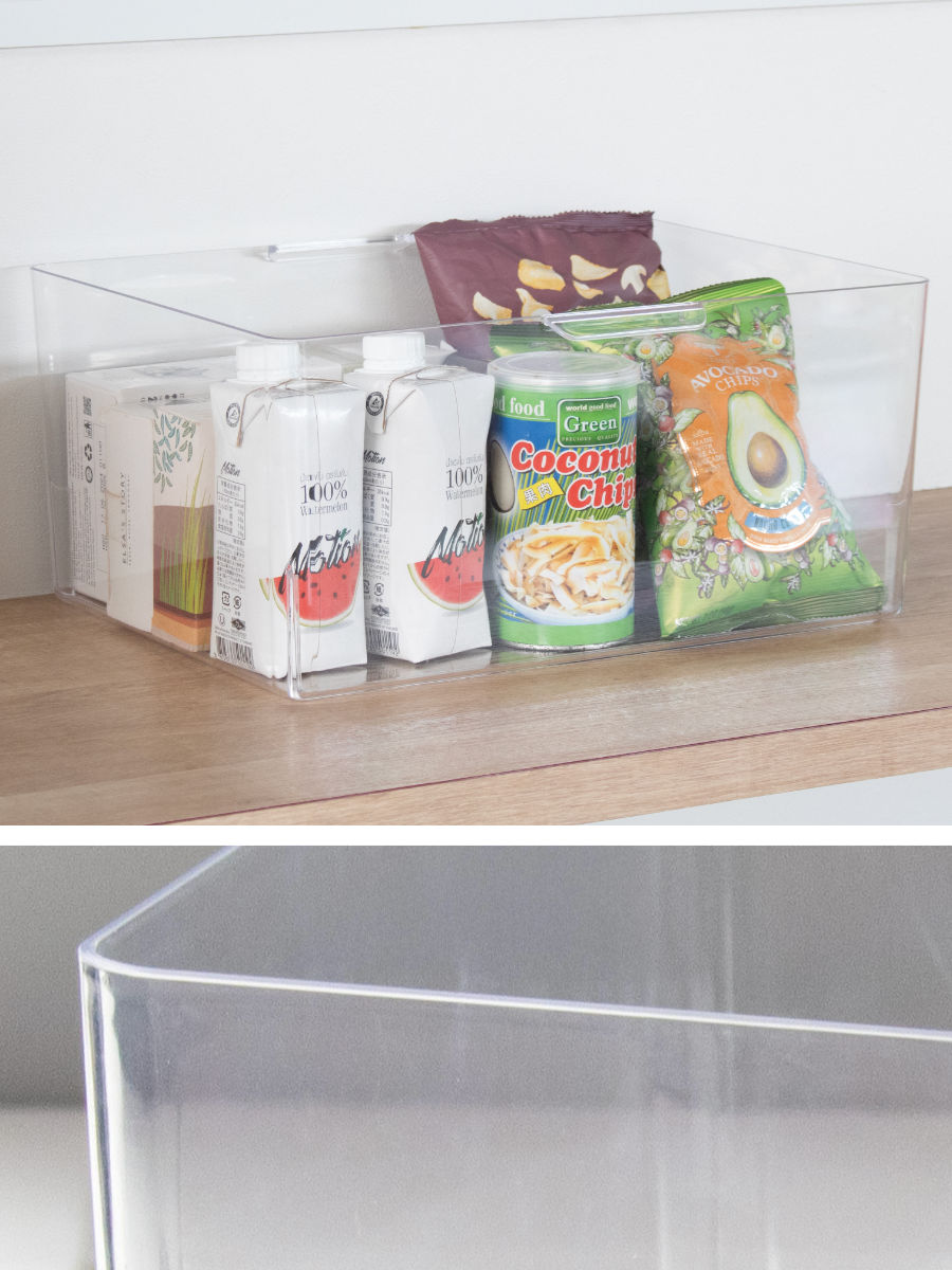 透明度が高い美しいフォルムが特徴の収納ボックスです。中身がひと目で確認できるので、ストック食材や洗剤、コスメ、おもちゃまで、何がどこにあるかラクに把握できます。探さない収納にしておくと、買いすぎ防止や時短にもつながって便利です。